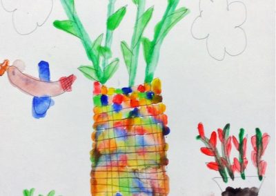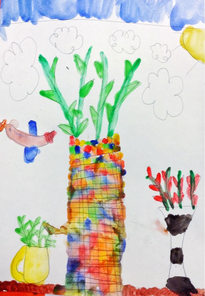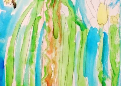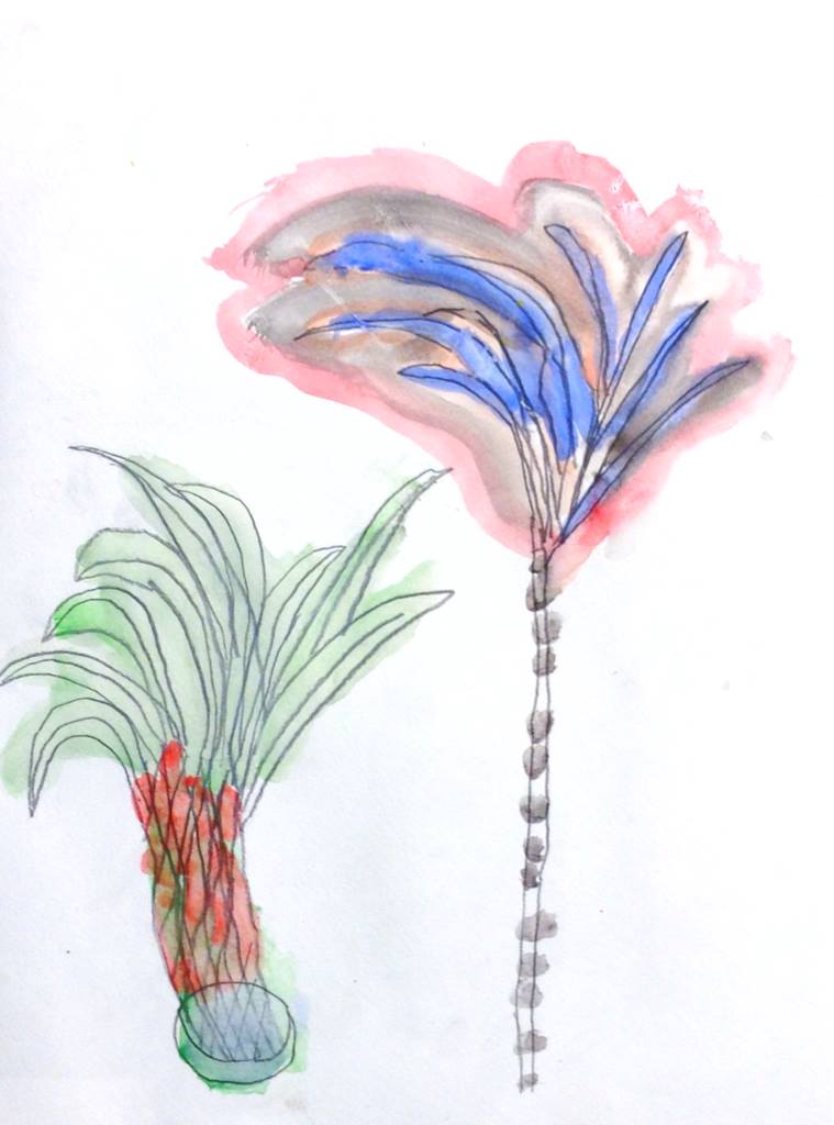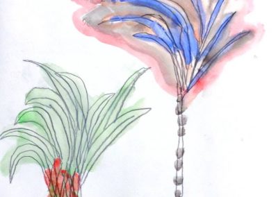 Students observe reference and draw plants using lines only. In the next step these are painted with watercolors.