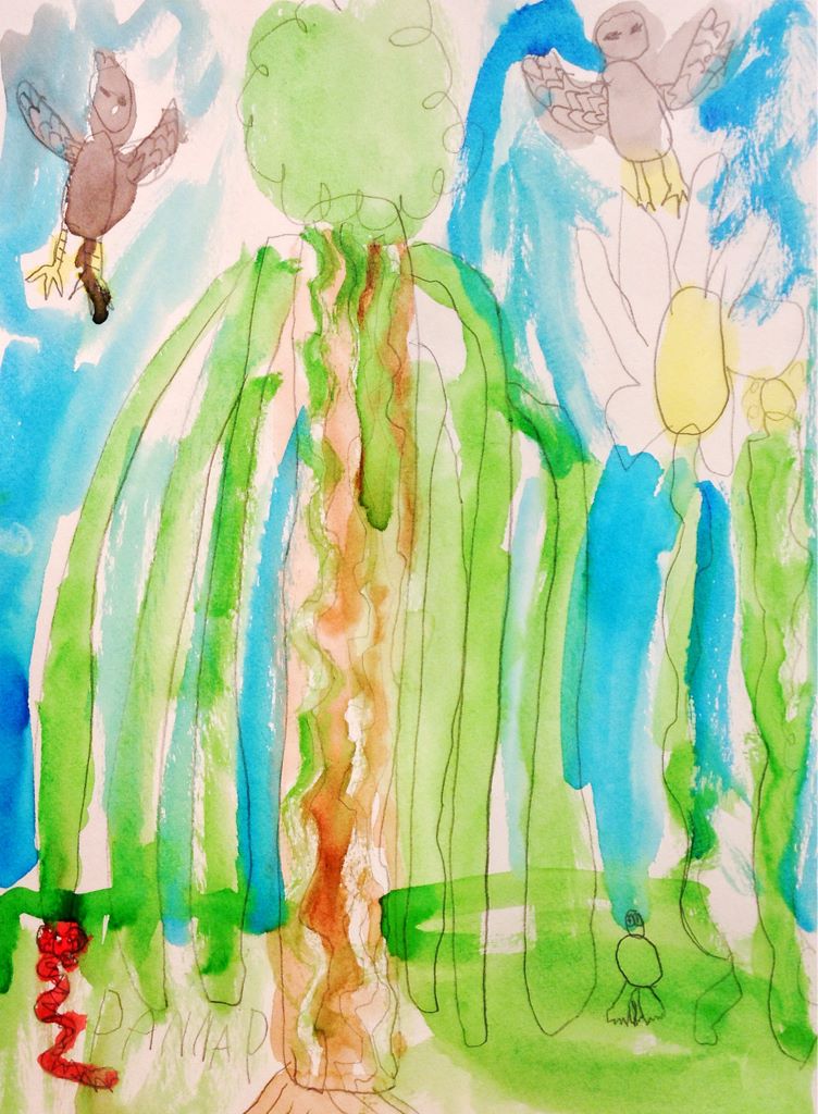 Let them paint in any way they want, but encourage using a lot of paint and water. Watercolors work best when there is enough watercolor on the brush so that the brush doesn’t have to be pressed against the paper – the bristles don’t bend when there is enough paint. This can be helpful, but is a hard concept for this age, so don’t worry if your students don’t get it.