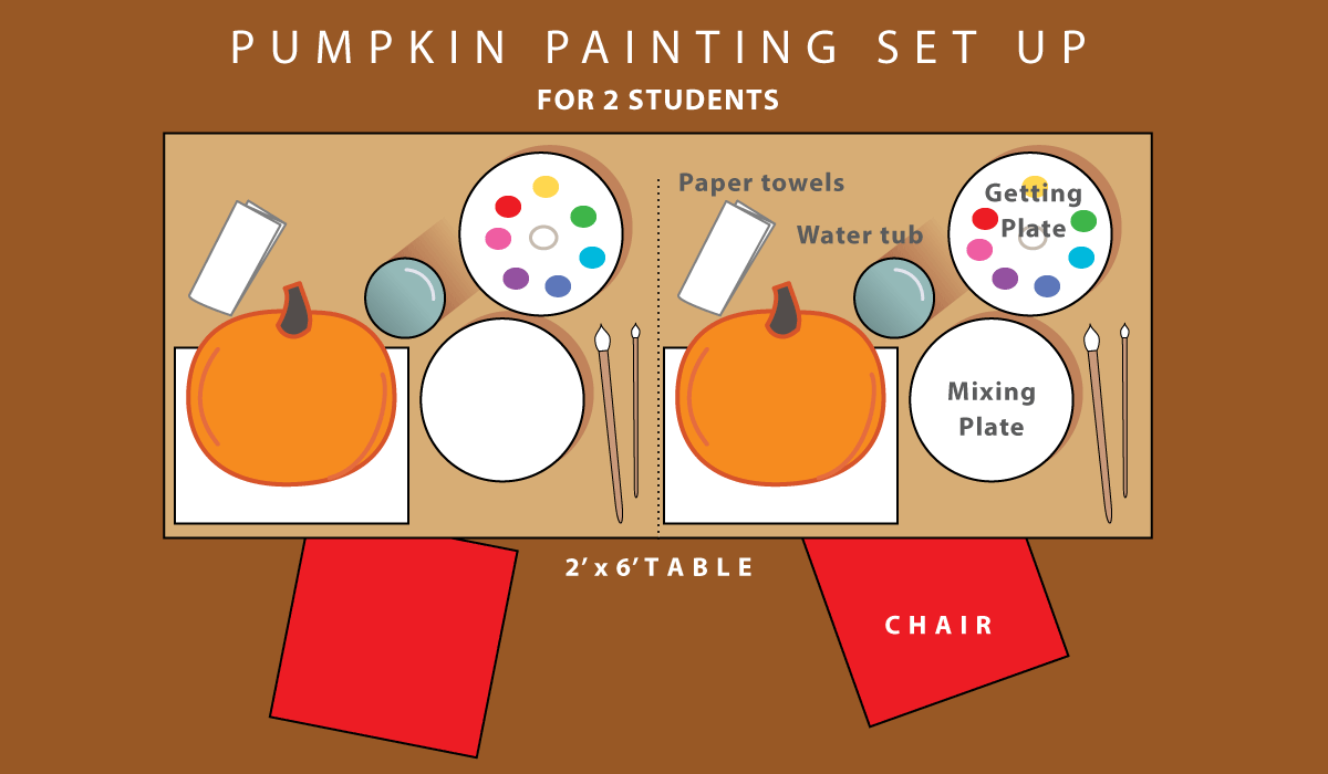Make sure you have a set of acrylic paints ready with a way to quickly set them up on several “getting” plates or trays. Have some extra boxes in case parents don’t supply enough, and it’s a good idea to buy a couple of pumpkins for those who forget if you have the resources and/or can charge the parents for them.