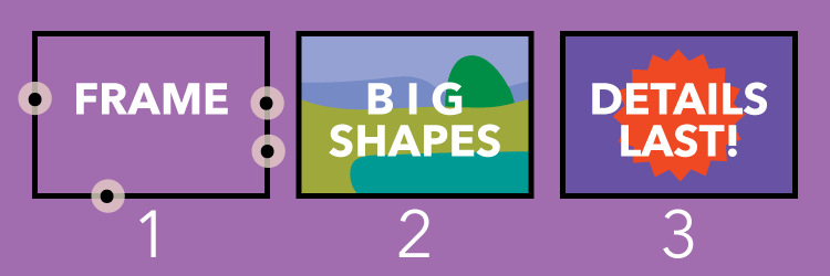Big Shapes – The ArtSquish term to denote the 4 to 6 largest shapes in a work of art. Most images can be divided into just a few of these very large shapes, which will intersect the frame on more than one side.