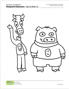 Give students a pair of scissors and have them cut from the top of the page, a straight cut line down in-between the two characters, but STOPPING when reaching the bottom of the character’s feet.