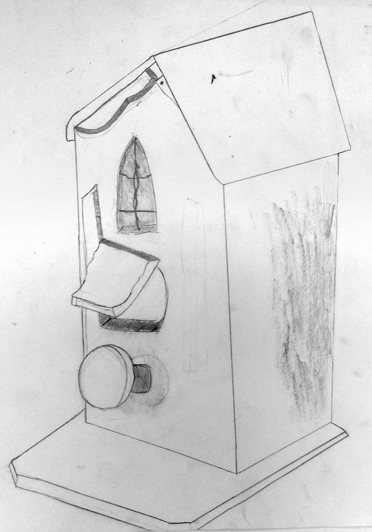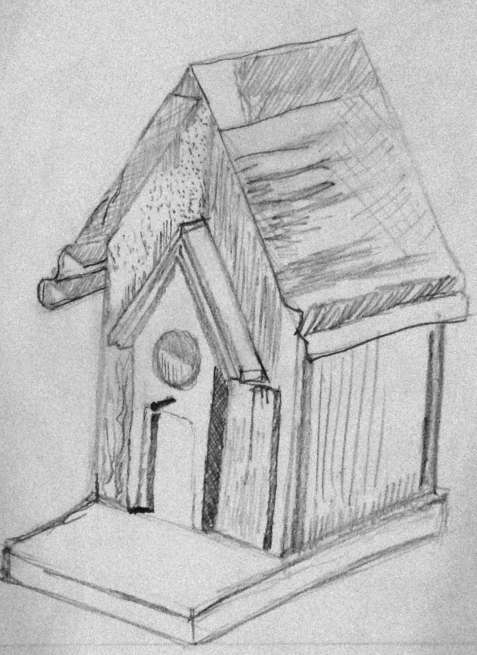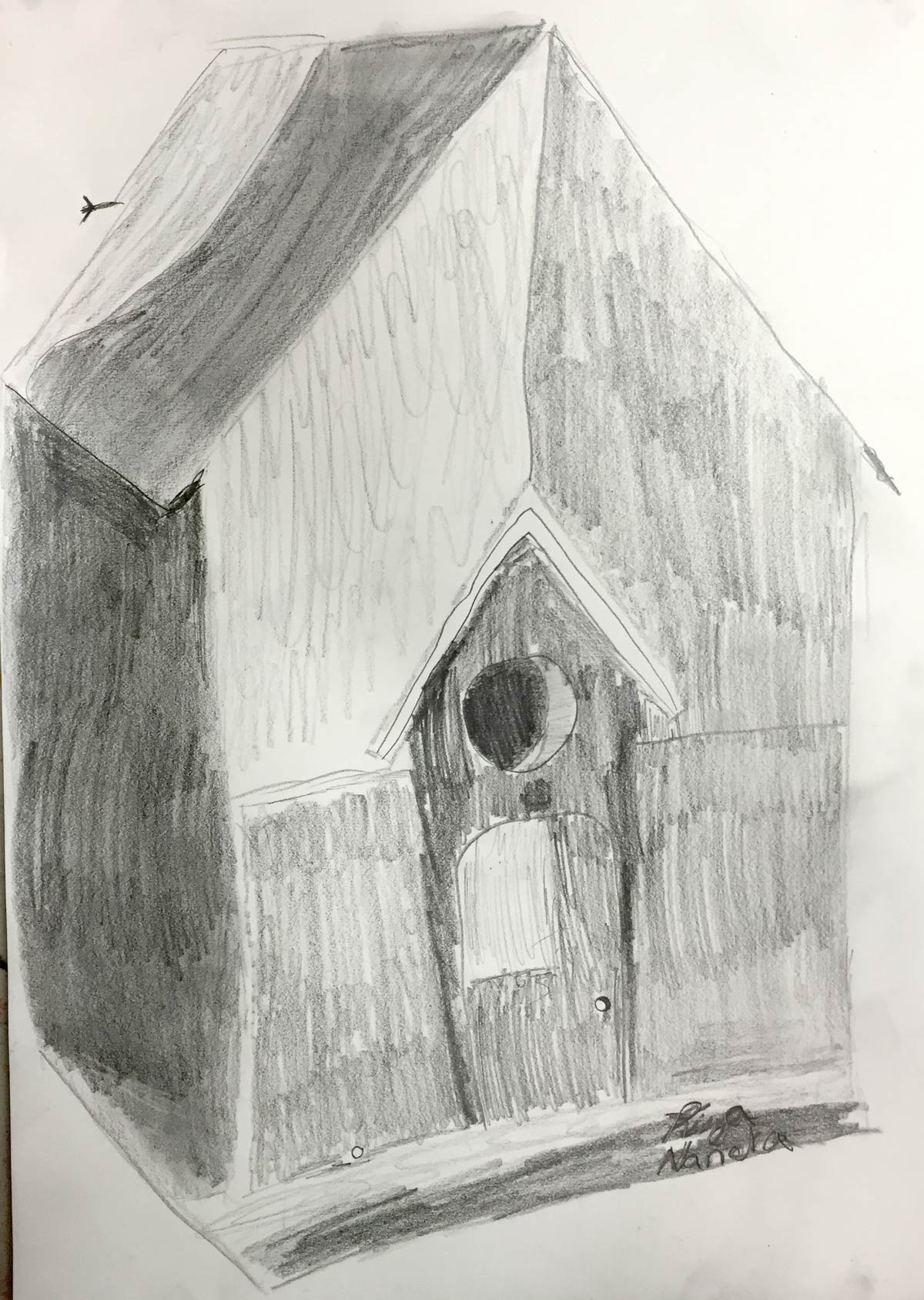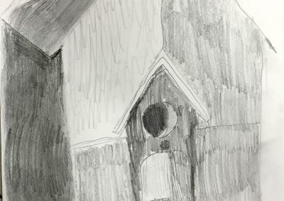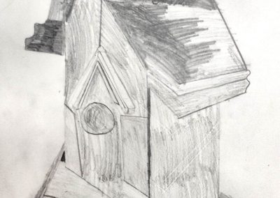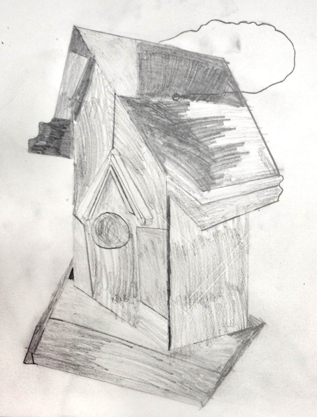 Everyone draws their birdhouse using good pencil techniques and taking their time.
