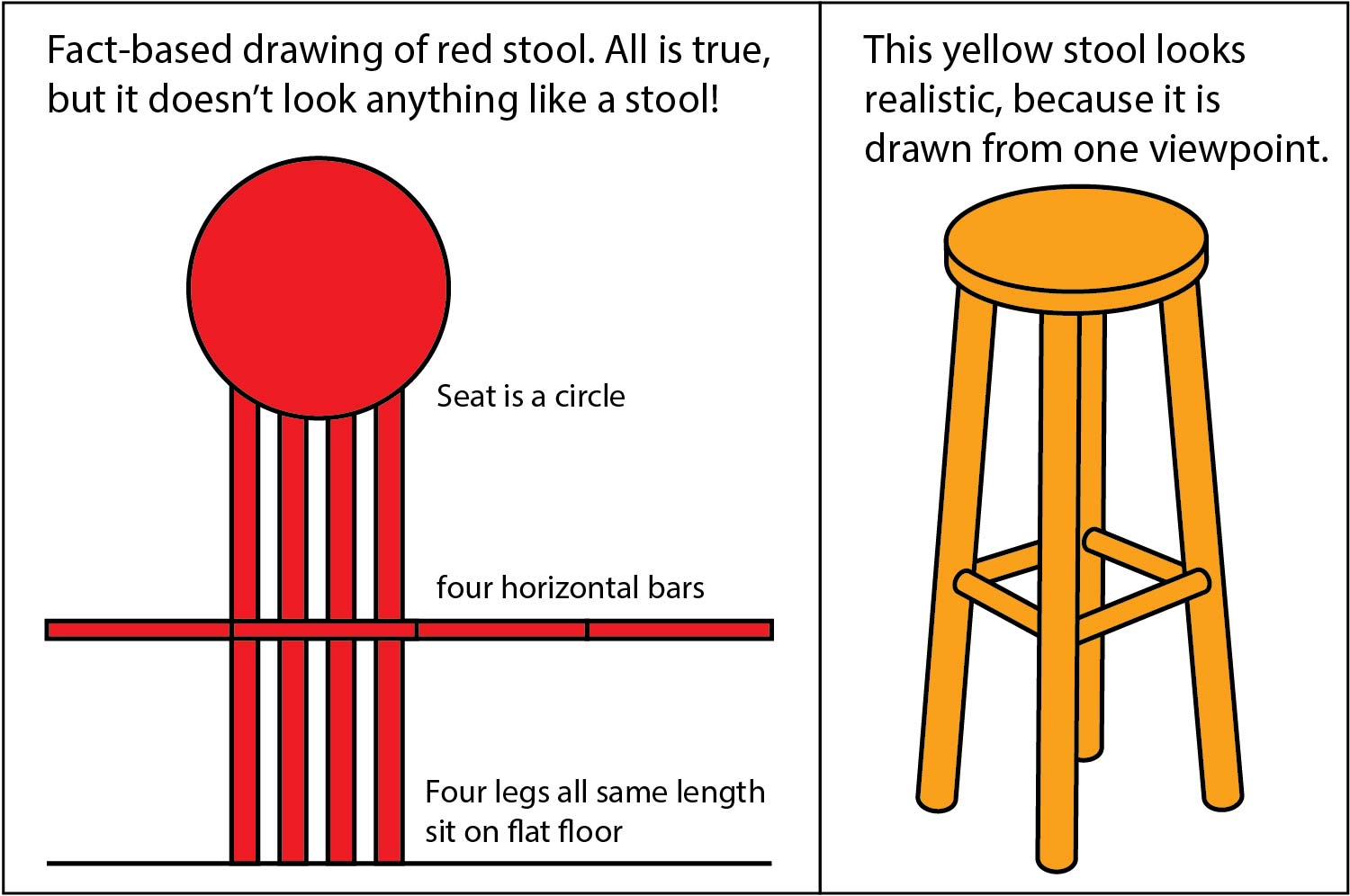 Discuss Fact-based drawings vs Viewpoint drawings using a stool. Then display the stool graphic and how silly the facts would make it look!