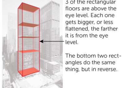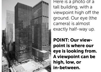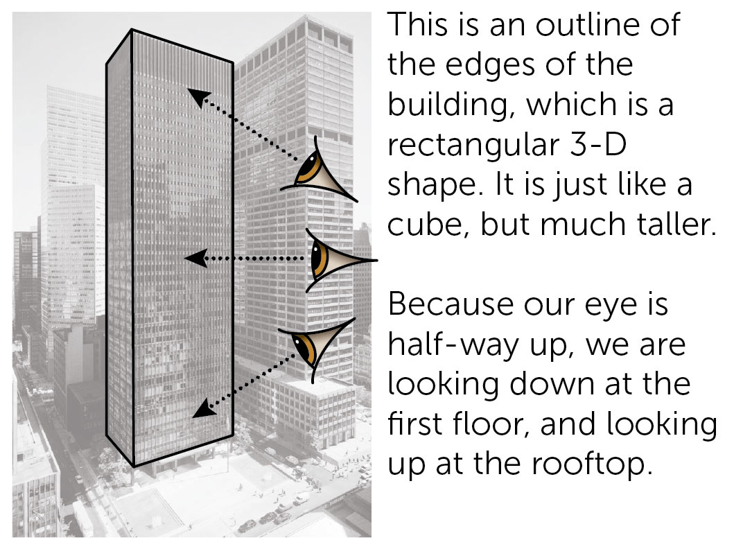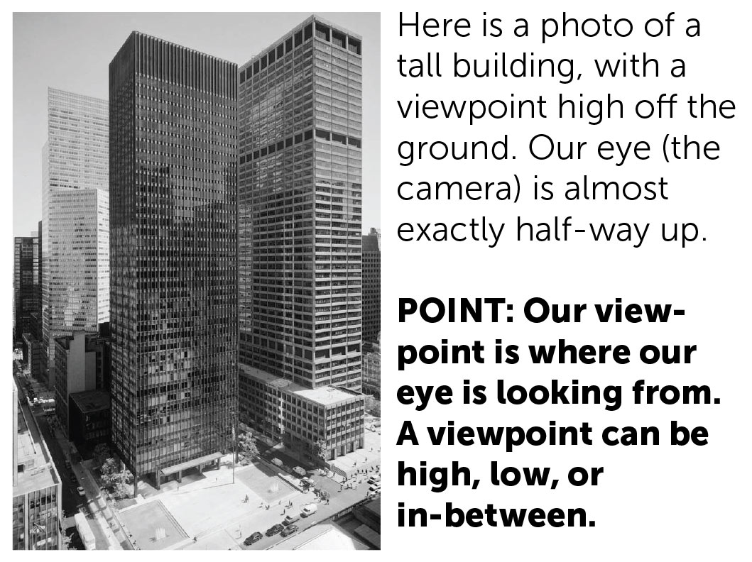 An artistic drawing is made from a VIEWPOINT. A viewpoint is what the thing we’re drawing looks like from one spot, where your eye is.  A Viewpoint drawing of an object is completely different from a fact-based drawing drawing of it.
