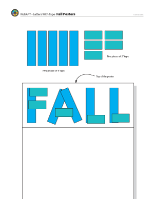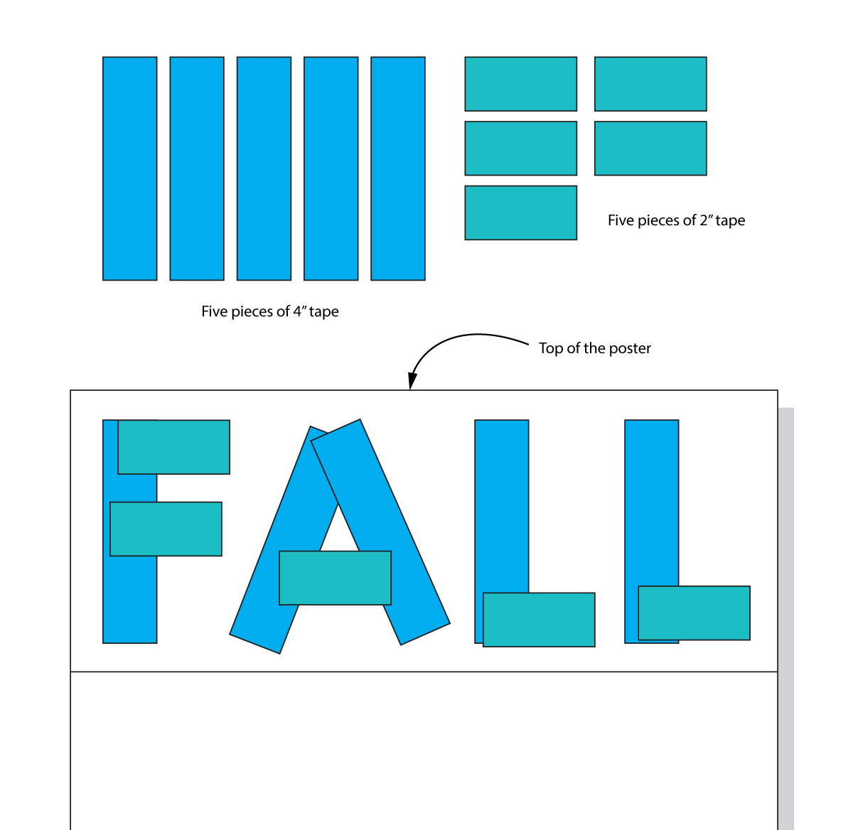 This top section will be the lettering banner for the poster. There are 4 simple letters to make the word, FALL in capitals. 10 pieces of tape will do the trick. Start with the first letter, F, at the very top and left side of the paper.