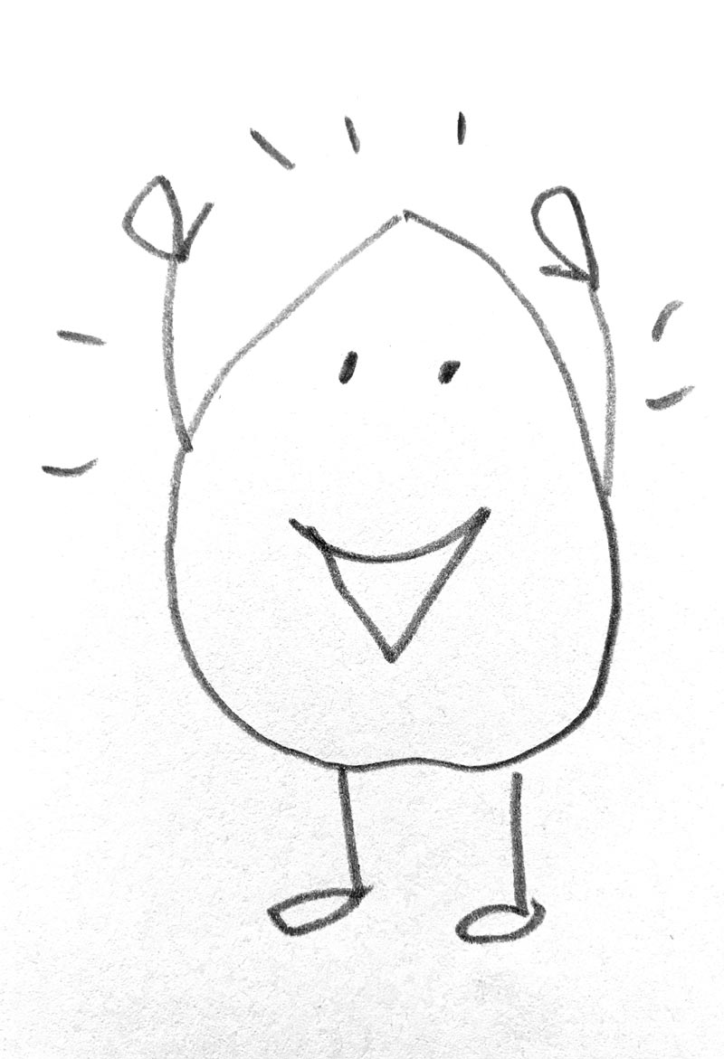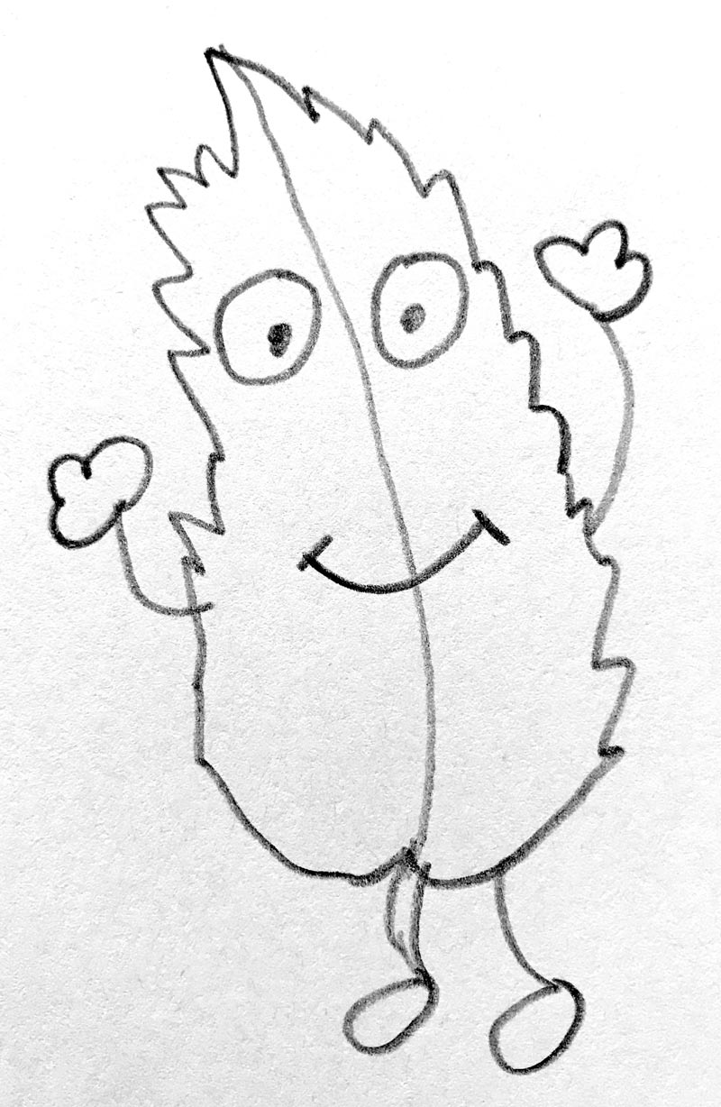 So lets draw some cartoon eyes and a smiling mouth on one of your leaf drawings. It’s Larry Leaf! Add arms and legs to Larry.”