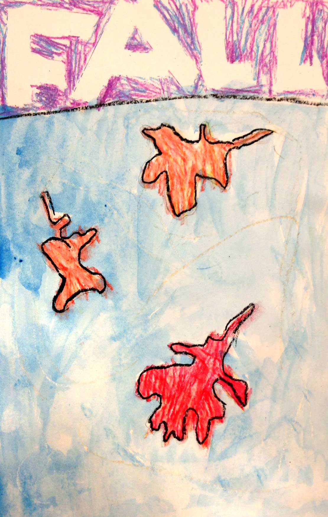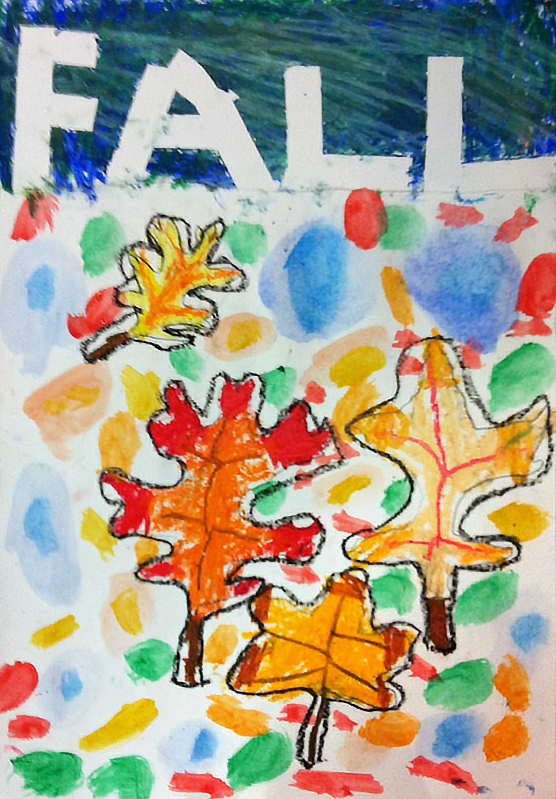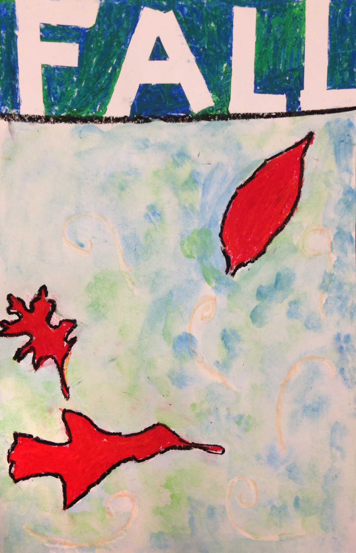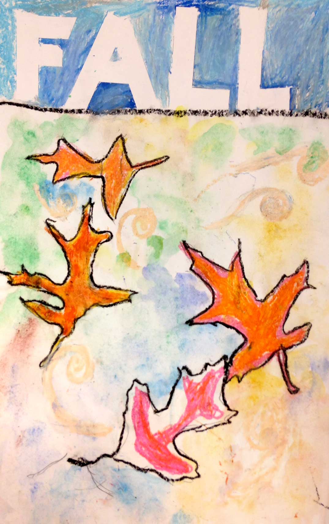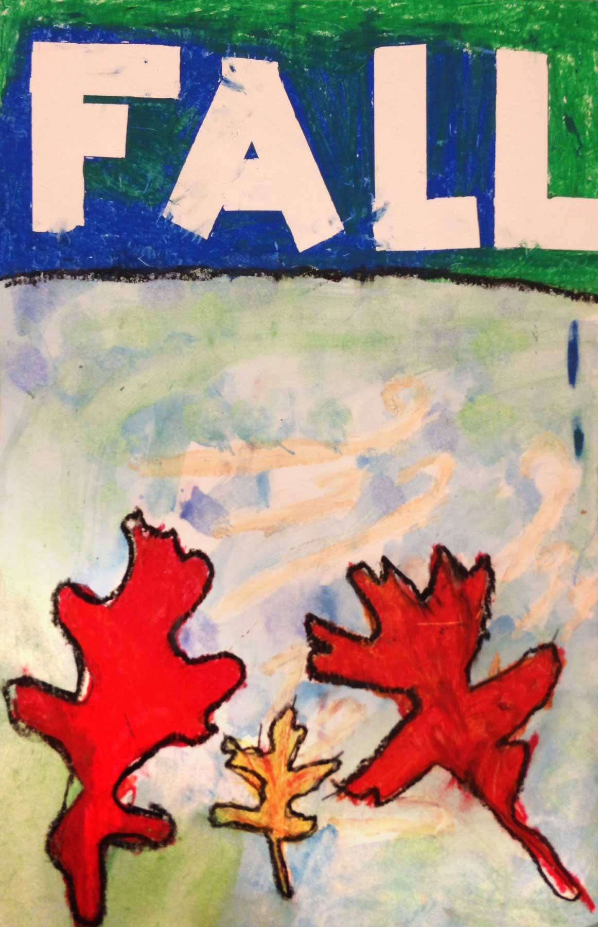 Students create a fun and colorful poster announcing fall, using tape-resist and oil pastels for the lettering, and leaf reference for the picture.– – –
