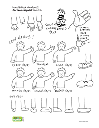 Some of the examples on the Hands & Feet PDF are really easy, and some are more challenging. Encourage your class to try different styles, but to not worry about which ones work and which ones don’t. That’s why everyone draws in different styles!