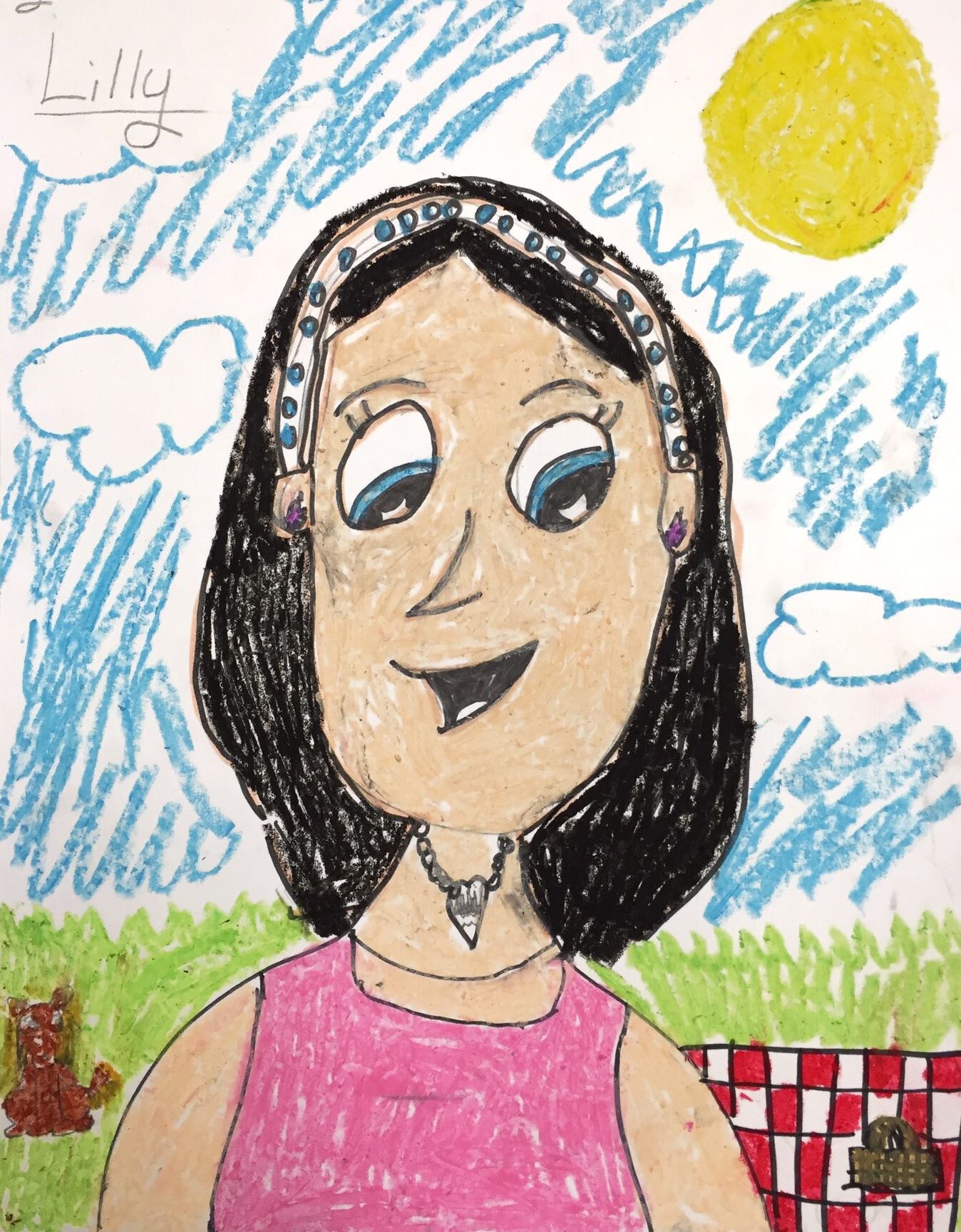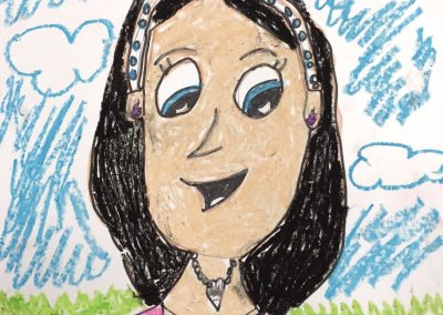 Remind everyone to invent colors by mixing and blending alike colors – with lighter colors, blenders, fingers, or paper towels. After all the color is done, make bold outlines with the black pastel. Early finishers can color the background too. Also, take time to fill in all the way to the edges and not to leave many empty spots. Cartoons look great when filled in fully.