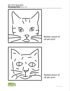 Students will look at artwork of cats and photographs. They’ll make some realistic drawings and cartoon cat drawings too, discussing the features that make them look like cats. A drawing will be used to glue yarn onto, creating a yarn-drawing print block that can be used the following week.Grades K – 2