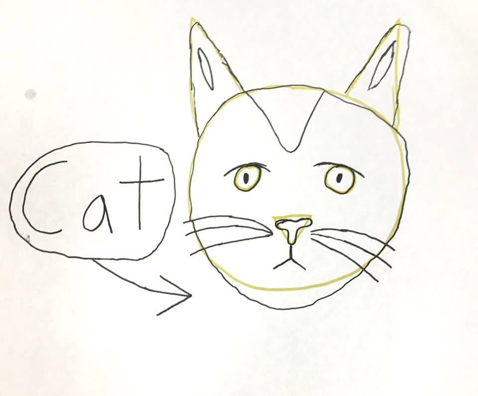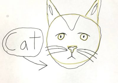“You’ve made a cat drawing! How do you know this drawing you just made is a cat? (let students respond) Well, yes, the ears are shaped like cat ears, and they are also right where we know cat ears go -up on top of the head, just like these. All those things tell our brains that these are cat ears. Our brain also sees other things it knows belong to a cat, like the whiskers. If you make the ears really long, and didn’t add whiskers, your brain might think you drew a rabbit.