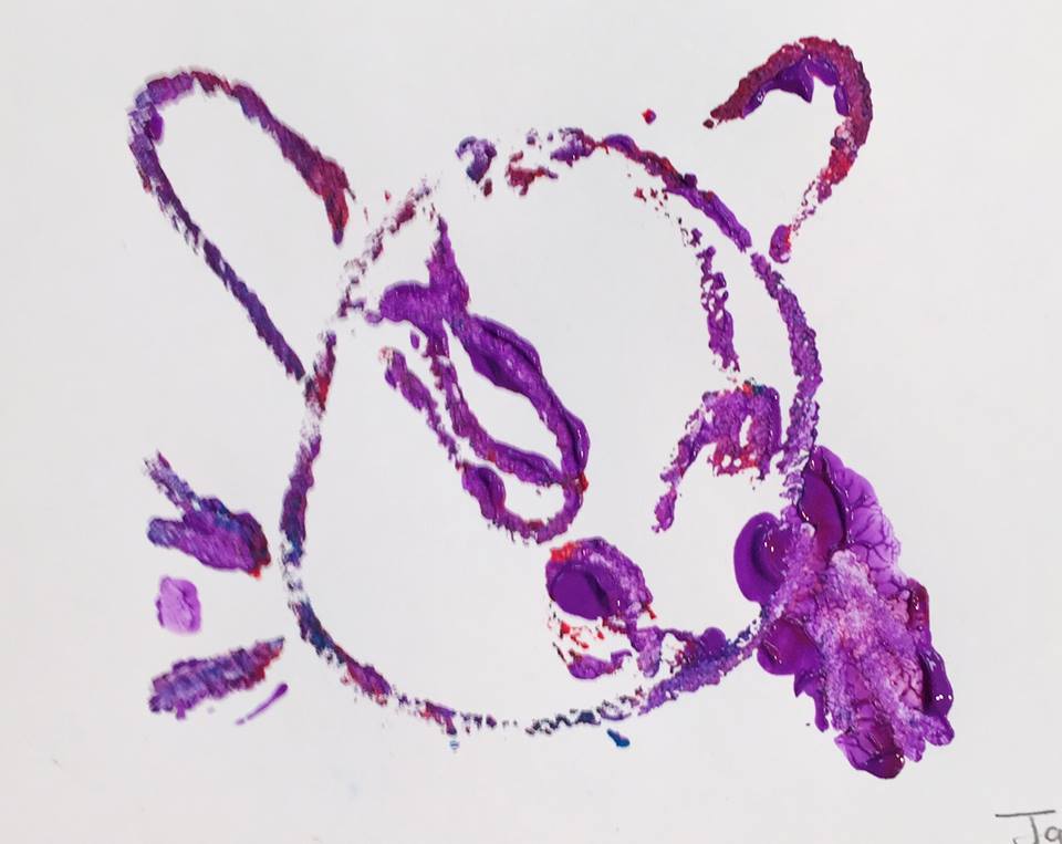 Show images of his cat painting and other cartoon like paintings.