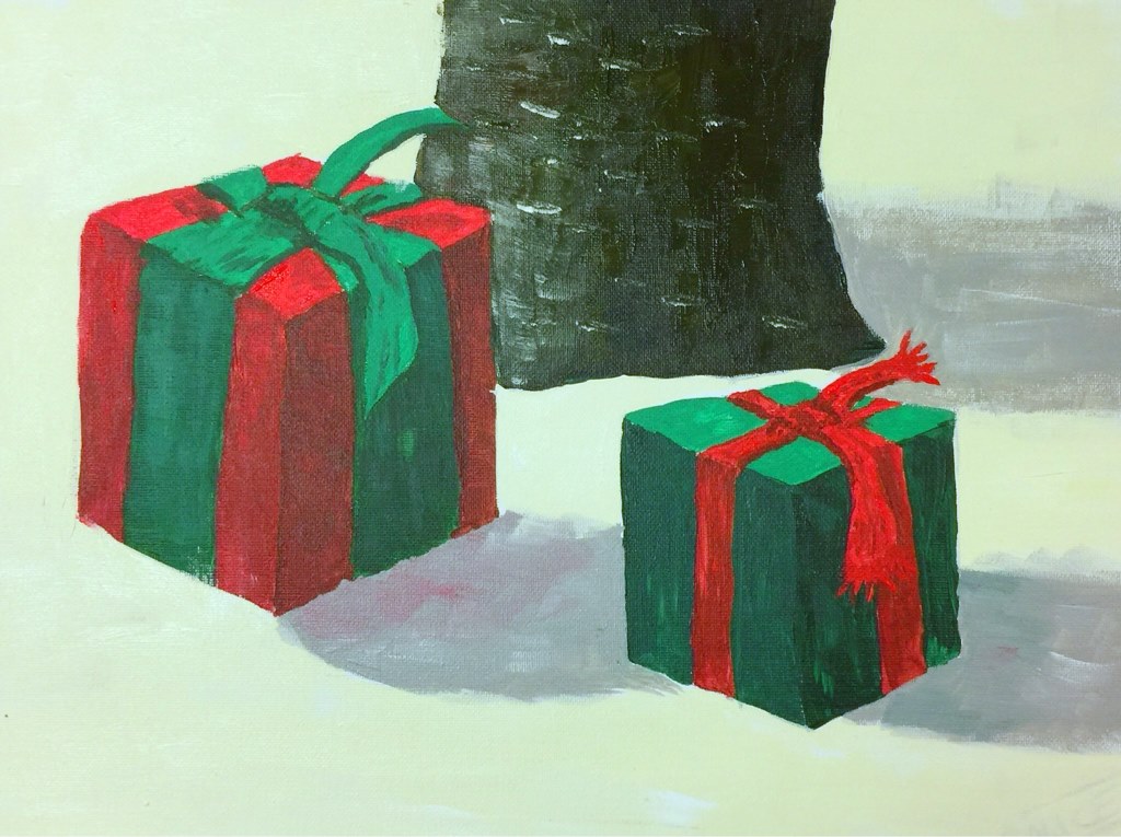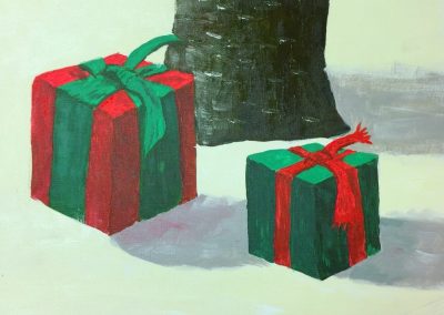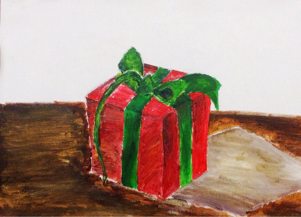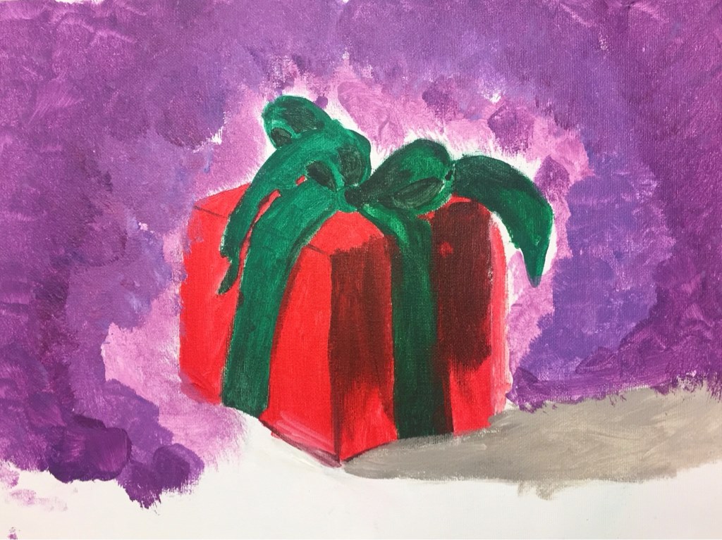 Using color in shadows is essential to good artwork, and so is understanding how basic shapes like a cube are drawn. Since it’s the holiday season, we paint a red-wrapped, cube-shaped gift with a green ribbon and bow. Students learn the basics of cube shapes and accuracy, as well as mixing pigment opposites to create shadow colors.– – –