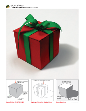 Photo reference of a cube-shaped gift in red and green colors, with some drawing guides at the bottom.