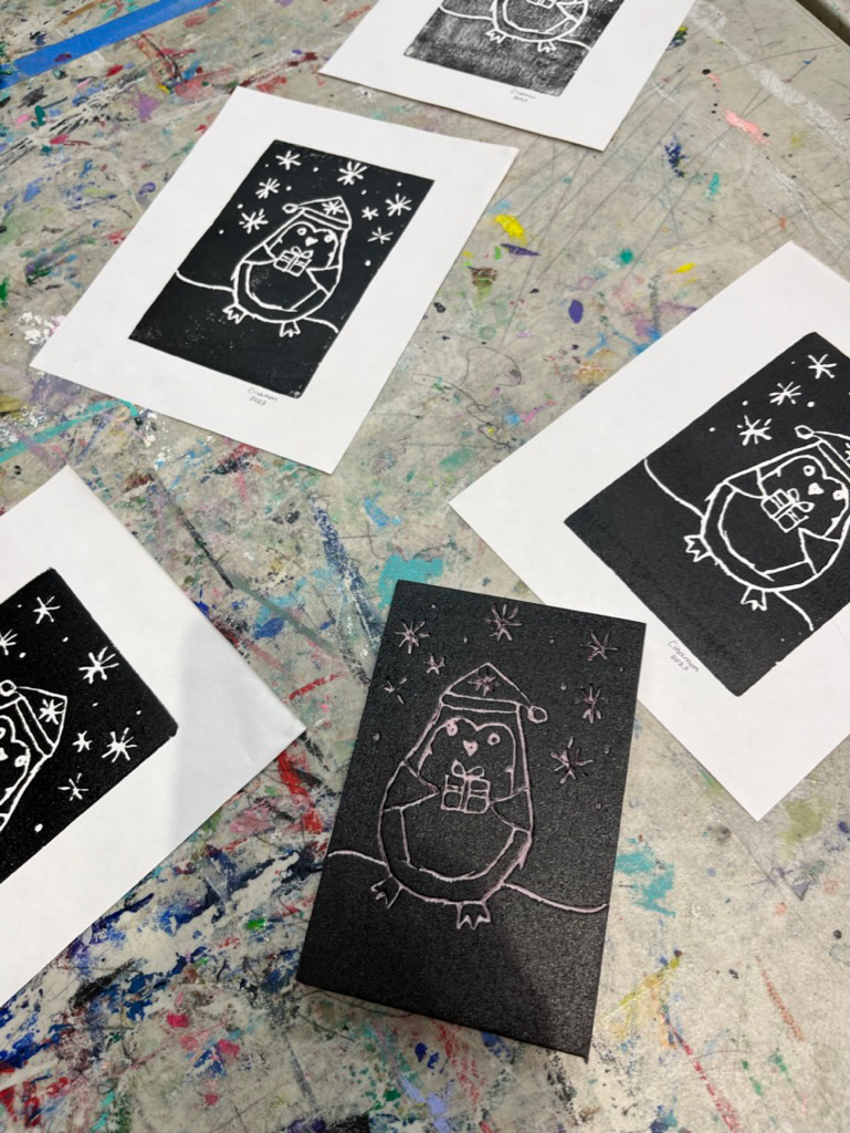 Everyone loves to get art for the holidays, so we’ll create Christmas (or other holiday) gifts for friends and family. Small works on paper are fun and easy to create, and make personal connections that are remembered for many years. Students create a drawing for a small piece of line art and then create a duplicate, or mono-print, using the original as both artwork and a printing plate. Then they paint both to make each one unique.