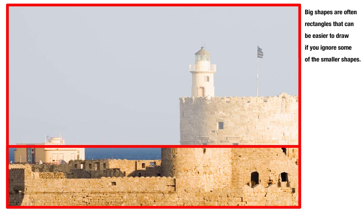 The biggest shapes are usually rectangles that define a group of objects together. Such as the sky above the coastal fort, but ignoring the tower shape that invades it. Guide lines are NOT the artwork. You use guidelines to help you draw the artwork accurately. Draw the guidelines very lightly so you can erase and change them several times without leaving ghost lines.