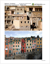 The advanced students can use the same references to find a photo they’ve not done before. The goal is to create a new watercolor artwork that is stronger than work done in the past. If you want to have a file with more challenging architecture photos, that’s fine, but the images we have in our PDF above do not require drawing in perspective, which will take extra time. Instead, the goal is to work on watercolor technique, color, and color composition. And also to enjoy creating. The latter may involve allowing more freedom for some students, but try to not let them lose the day in selecting reference and sketching.
