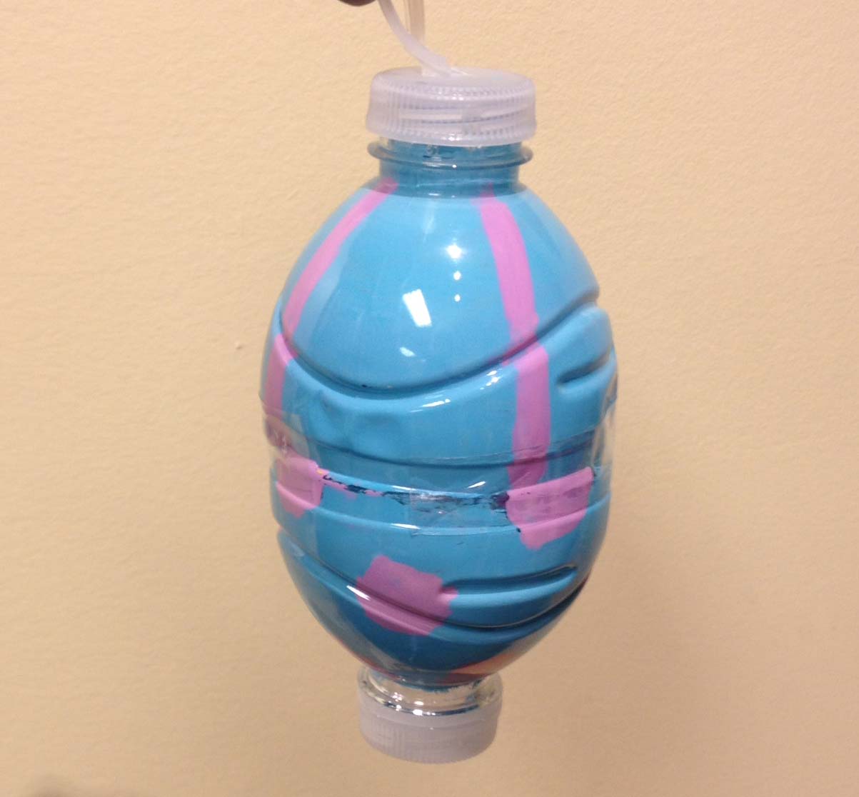Overview: Students enjoy a fun and artistic project along with a holiday party. Used plastic water bottles are re-used to create a unique, environmentally friendly, hand-painted Christmas tree ornament. The tops of two bottles are cut off and the artists paint the inside using acrylic paints. The exterior looks like beautifuly colored glass, and when the two pieces are taped together, they make a nice classic ornament shape. Even the cap ring is used for a hanger.– – –