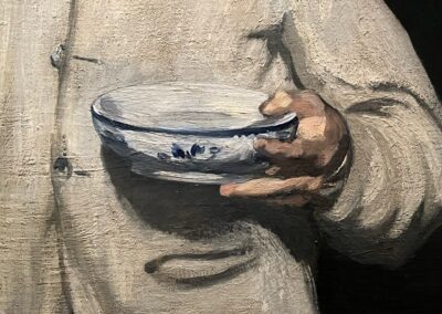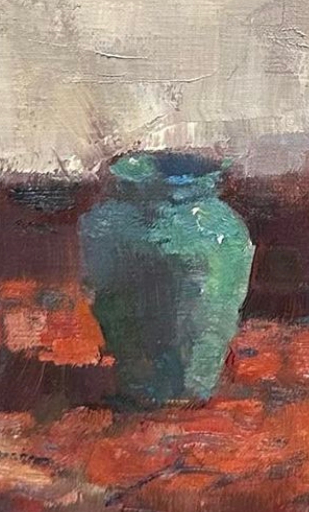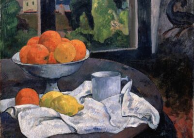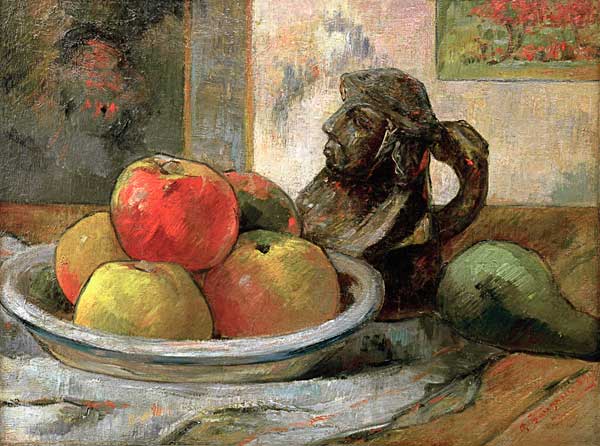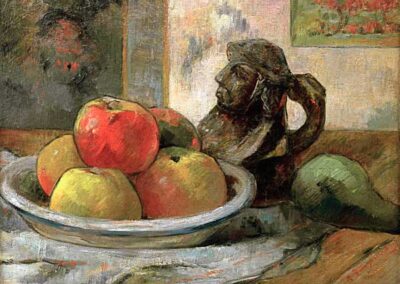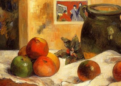 Gaugin struggled with cylinders and never fully understood how to draw and paint them accurately. He sometimes covered the bottoms of still life objects with cloth or other objects to hide this fact. Look for the kettle in the second image, which has a too rounded top, and a flattened bottom. Other works show flattened cylinder bottoms as well.