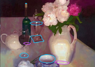 Using recent lesson insights will be helpful when drawing a detailed still life of bottles, bowls, fruit, and striped fabric. The drawing will continue for two weeks instead of our usual one.