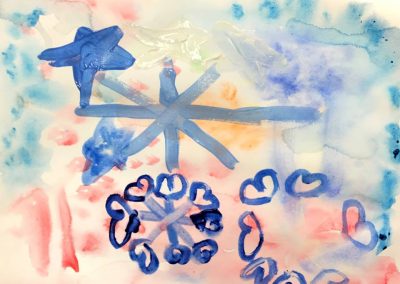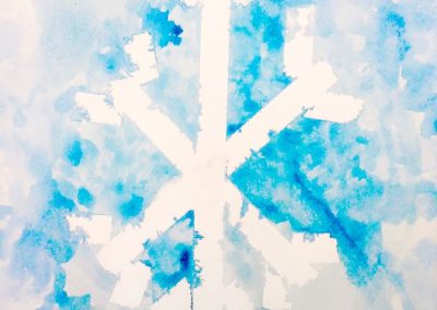 Artists can now start painting snowflakes on their paper. Remind them of the steps they took to make a snowflake in pencil. It’s easier to make thin lines by barely touching the paper and going slowly (but the small brushes should help a lot). If you have early finishers, set their paintings aside and have them help clean up their area.