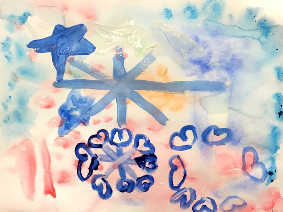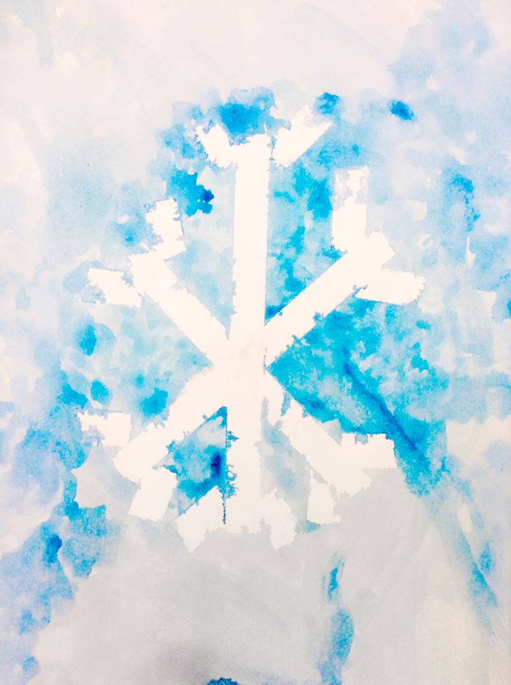 Ask your artists what color would be best for painting snowflakes – (white). White will look good on their watercolor backgrounds, which are full of mostly pale colors. Have your students line up to get cups or bowls and let you put some white paint in it. Then they can take this back to their seats and get a brush, and a paper towel. Praise them for helping set up. Artists must learn to set up, and also to clean up.