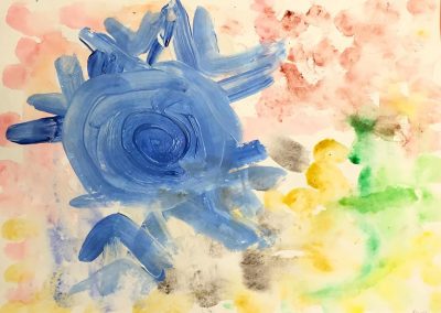 Now tap the brush gently in one spot on the wet paper. The color should spread out into the wet paper. You can tap 2 or 3 times in the same spot for a stronger effect. Try a few more spots with this color, but no more than 3 spots. Rinse out your brush now, and grab a new color. Make sure to keep the colors away from each other! Only tap color into new blank areas on your paper. Continue adding colors until the paper is covered in color. It’s important to only tap once or twice in one spot, and not wipe your brush on the paper at all. Stop adding paints as soon as the paper is mostly colored.