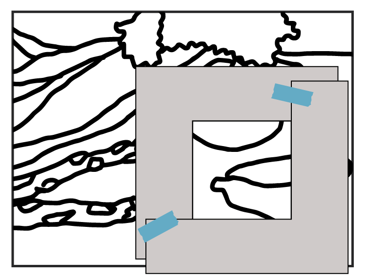 Use a pencil and make guide lines to create line drawings inside the new, larger square frame on the watercolor paper. Make sure that students do not press hard, because this is not a real drawing, but a guide line drawing, and we may want to change it around a bit in the next step.