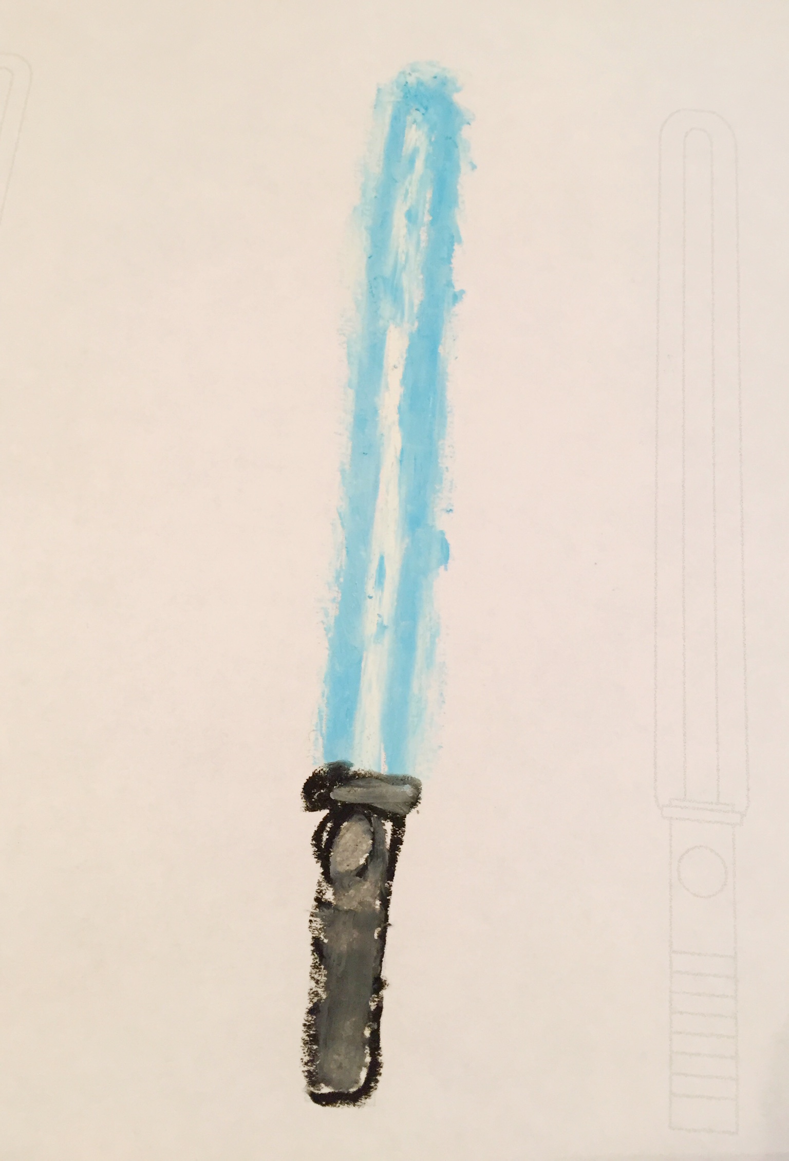 Point out how it is lightest in the center of the “blade”. Then you can switch your display to the slideshow below, or you can demo the process for them yourself. Everyone will begin with the light sword “blade” and wait until that’s finished to make the handle.