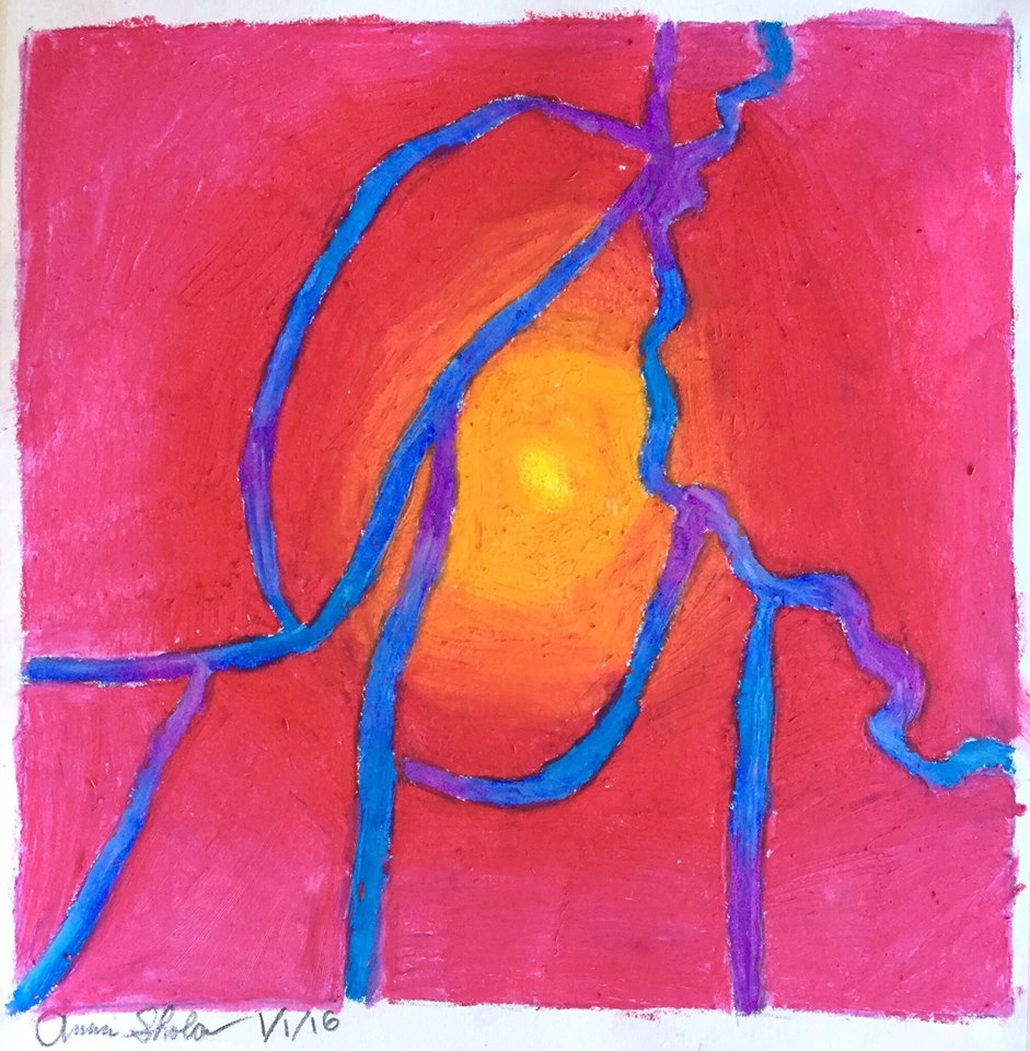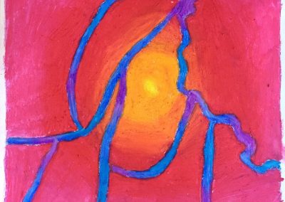 Use the white oil pastel and go over all of the color, letting some of it get outside the outer edge, and also a little bit in the center white area too. Keep the center bright white though. Think about how lights glow as you work.