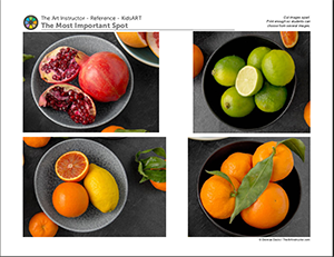 Emphasis is one of the most important aspects of good composition. However, this is a lot of abstract thinking for kids, so we say, “every artwork needs a Most Important Spot!” The lesson helps students think about what is in artwork, and to distinguish between wallpaper type designs and art that has that important spot that you see first. We begin with a fake art show using textures on paper but nothing else on them. Then we do some exercises with color. The end of the class has students taking the art show down and fixing the work by adding an important spot.– – –