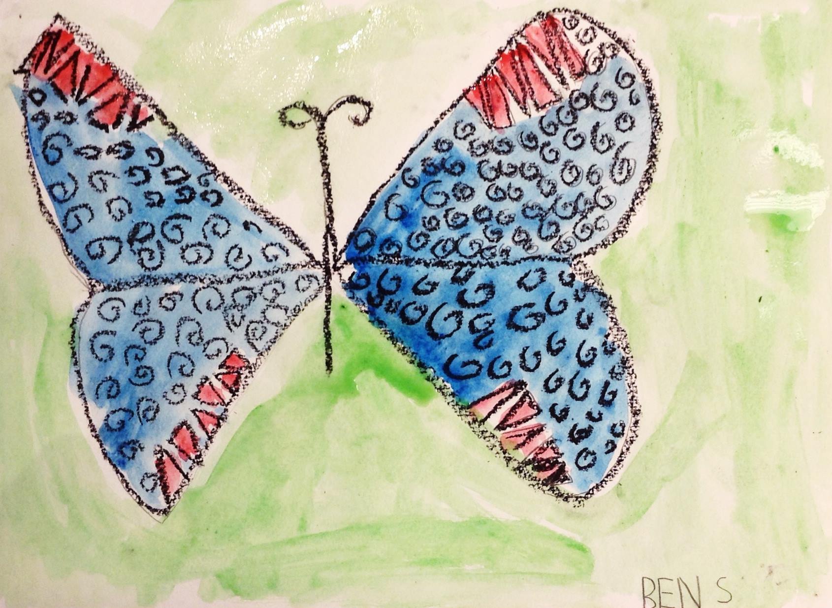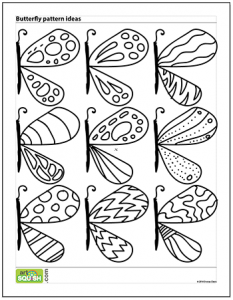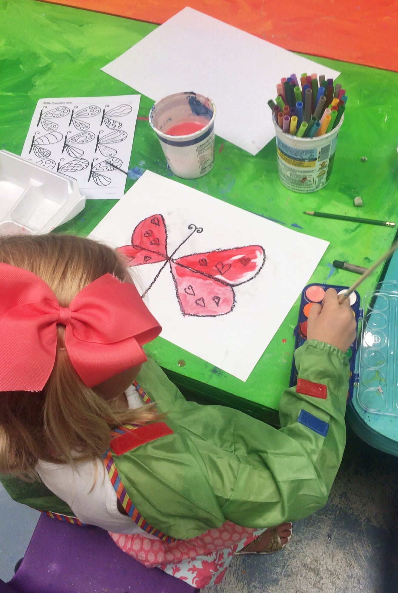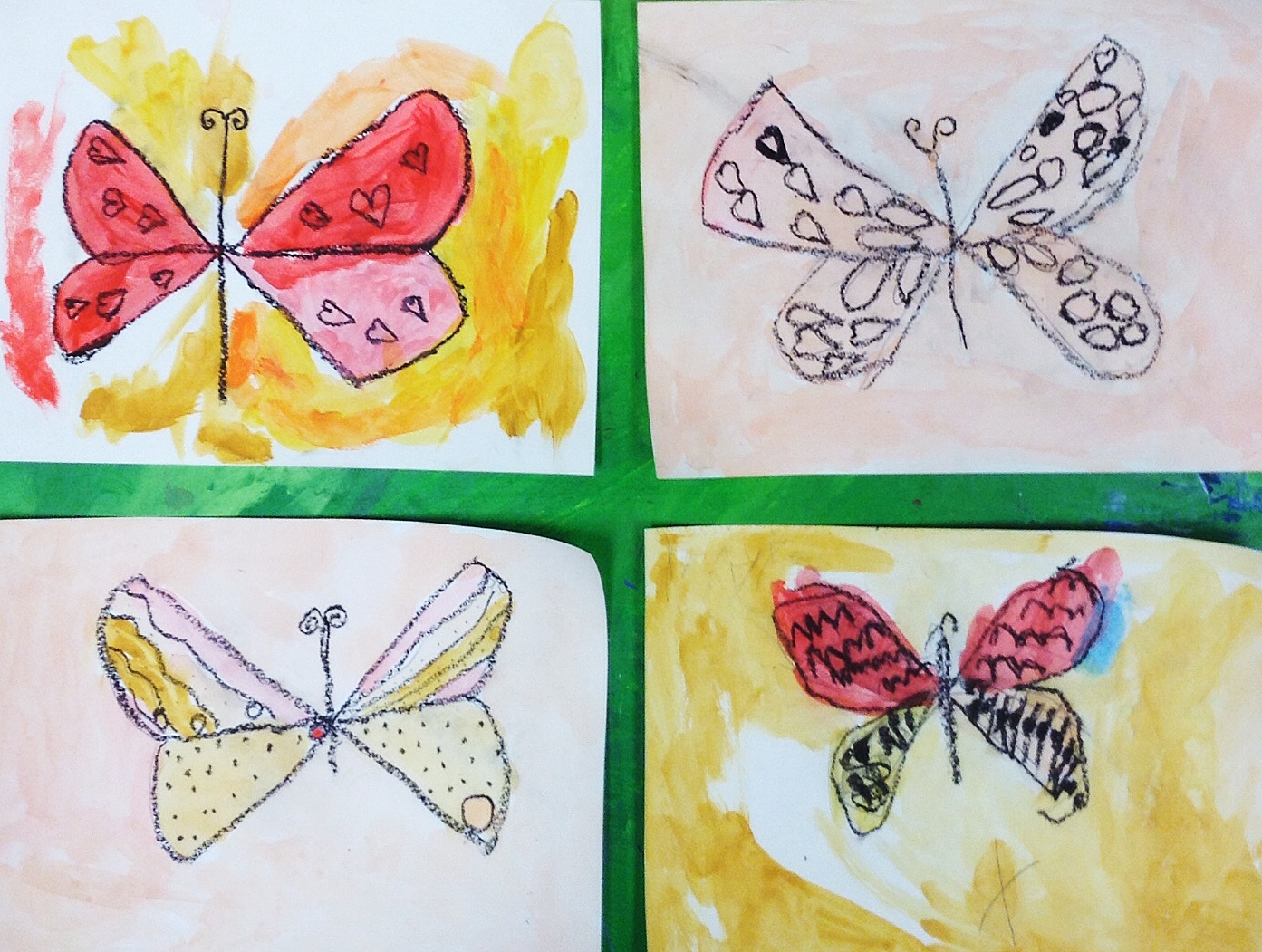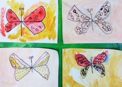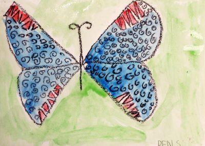 Students make patterns on their butterfly wings. The pattern handout will help but it’s also ok to make up your own patterns. Let students go right to oil pastel without drawing guidelines in pencil first. Just have pencils ready in case someone wants one.