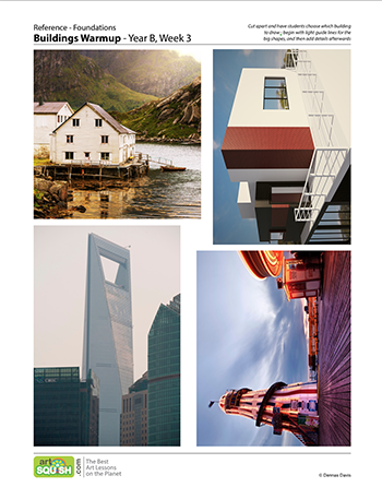 Read the Teacher Talk below as students work on drawing their buildings for warmup. Elaborate on drawing big shapes first, and details last.