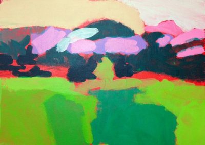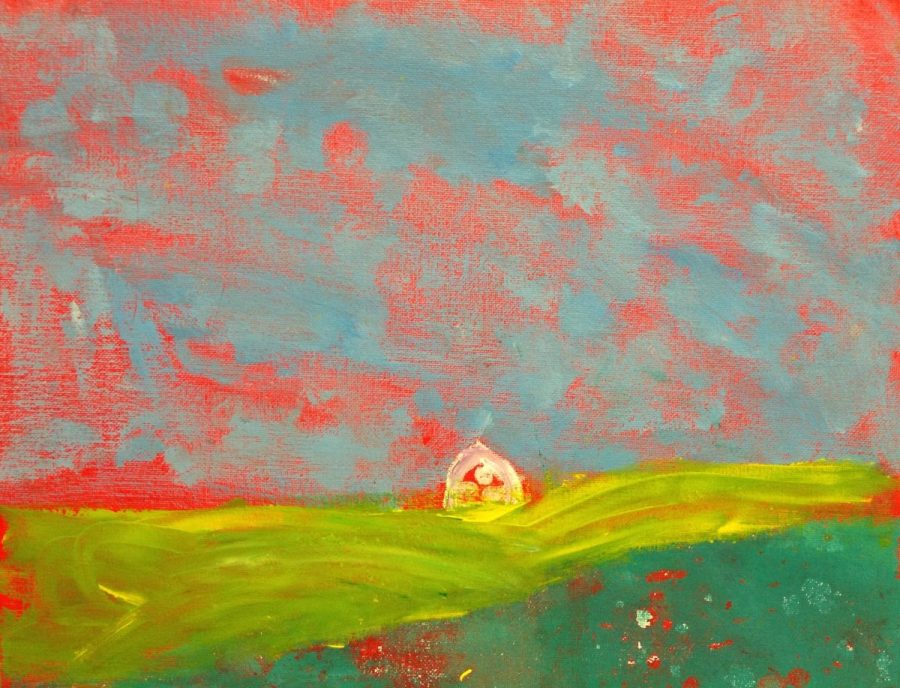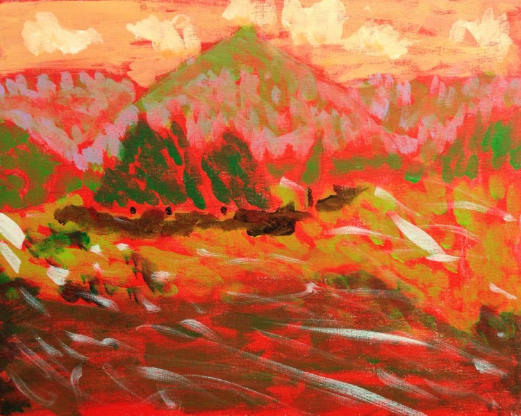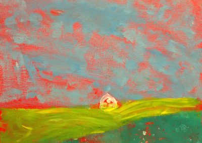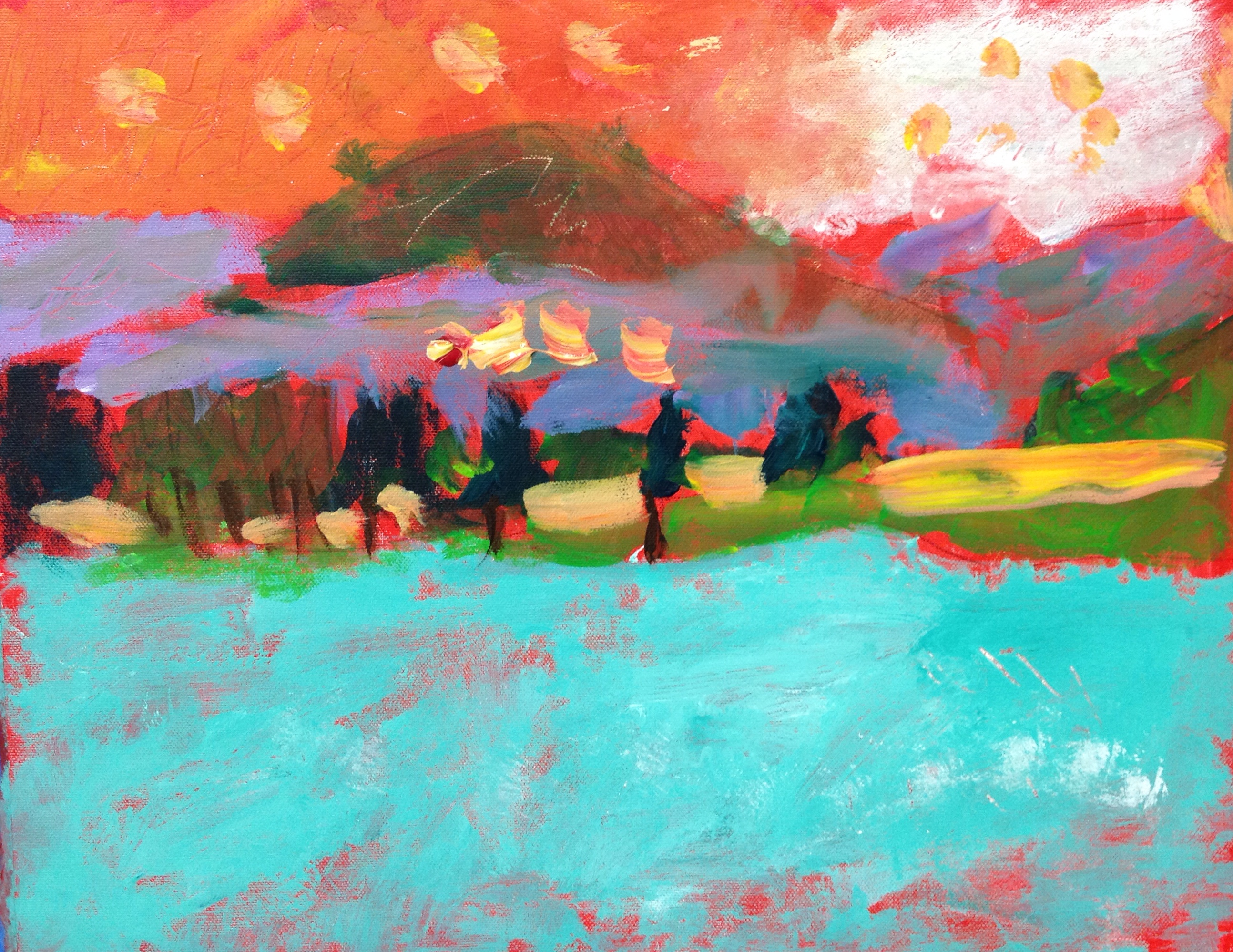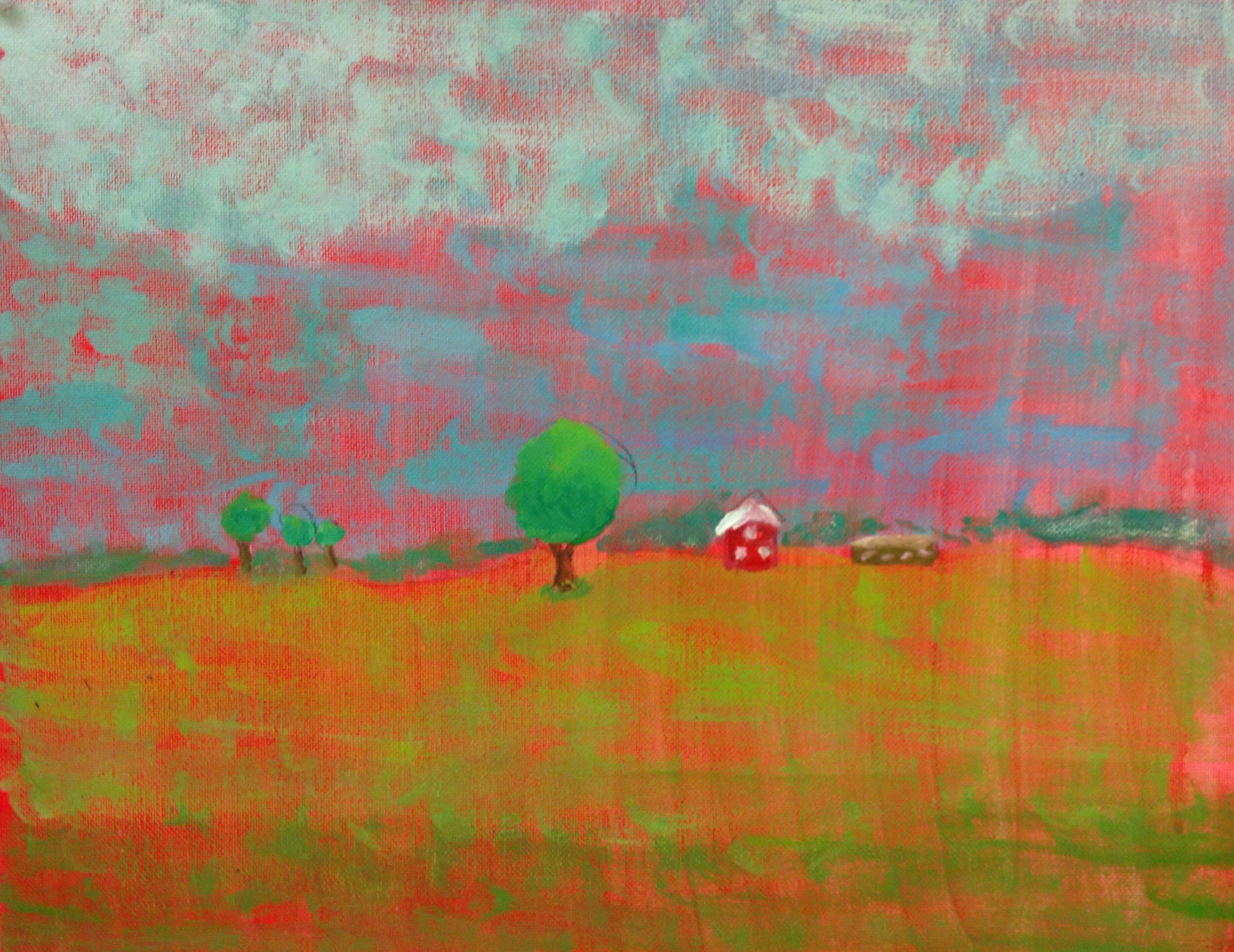 This is a really fun way to paint a landscape! Most of the red will be covered up, but you can paint loosely and let more of it sneak through. Just use a very light touch with your brush for the clouds. Think about how fluffy clouds are. If you use the side of your brush, and don’t actually bend the bristles, you can graze the surface lightly and do some very nice clouds.