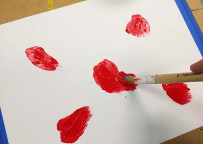 Shading and details – When the students are creating their guide lines on the red canvas, the special canvas pencil is used. Since it is wax-based, it will resist the paint a bit if you do shaded areas. Therefore it’s not a good idea, and there’s not enough time to spend, in shading with the pencil. Students can get into the drawing, though, and forget that they’re only creating guide lines.