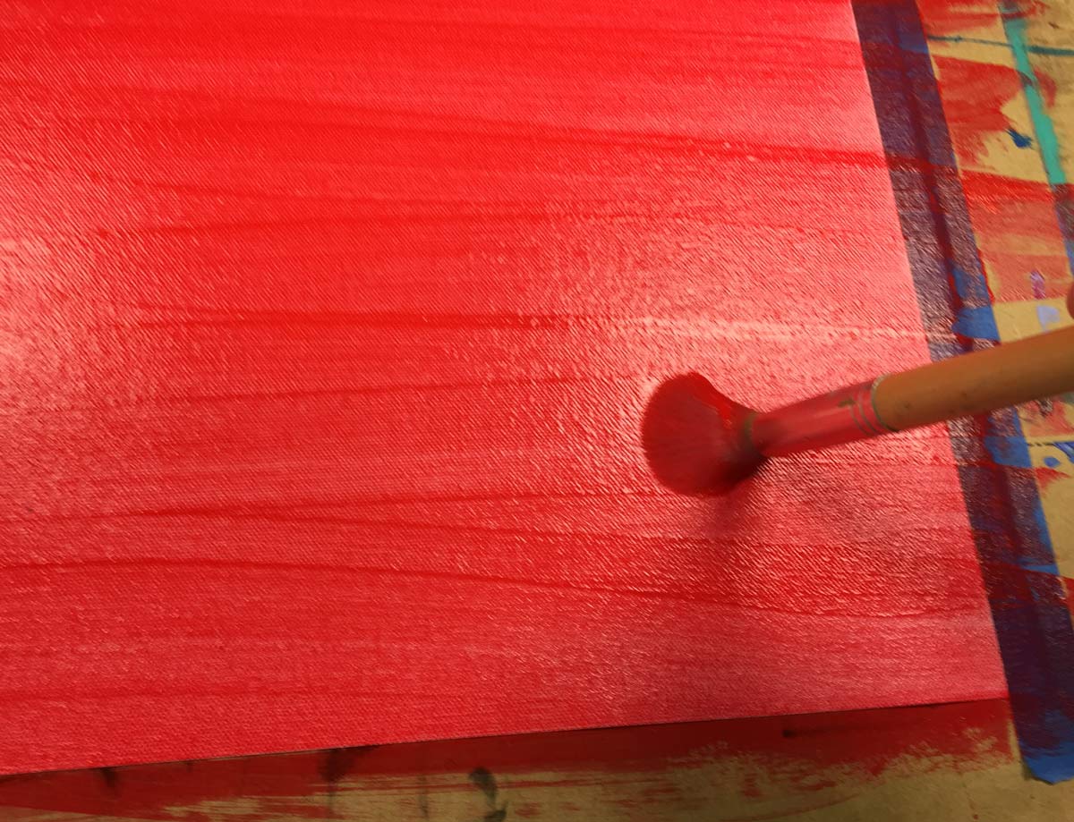 Step 1. (15 minutes) UNDERPAINTING • Set up for painting in acrylic, and cover your canvas with a thin coat of a bright warm color of your choosing for an underpainting (not a background). Brilliant colors work best, so colors should be mixed with water instead of white, for a glaze effect. Landscapes look good with red. Orange and Pink can also be used. Keep the paint spread out so it will dry quickly. Set aside to dry.