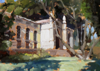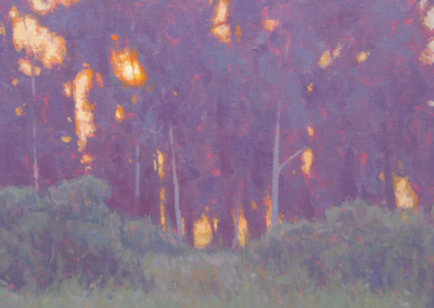 Mashing brushes into the canvas – This is needed for the underpainting, but when getting to the sky in step 10, this kind of hard brush work will not do well. For this project we are trying to layer the colors over each other, and for that, they need to show through. A light touch, and using the side of the brush is needed. See the “tickle brush technique” in Art Words, and show the demo.