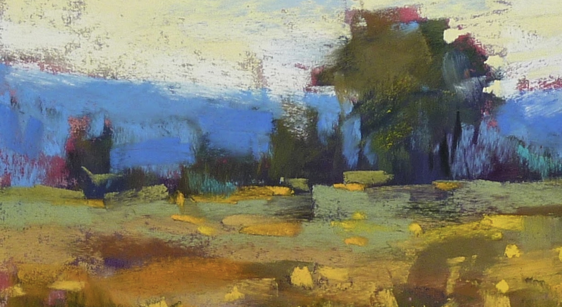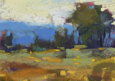 Using only the 2 blues and white, have students loosely graze-brush their sky, working with medium-dark blues and finishing with light blue (almost white) for clouds or a bright sky.