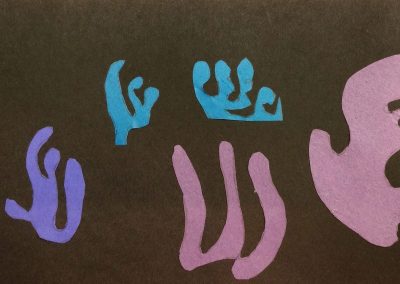 Have the students pick out their favorite cut out pieces. Then have them find a background sheet of paper to use for their cut paper artwork. It can be colored, or white. Move the cut shapes around on the background paper until you find a design you like. Carefully glue down the pieces one at a time, pressing firmly.