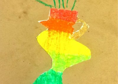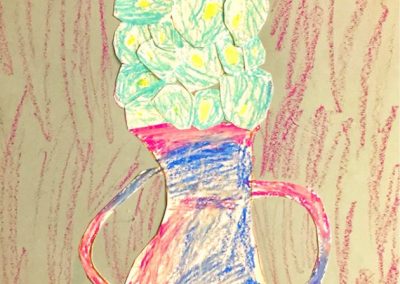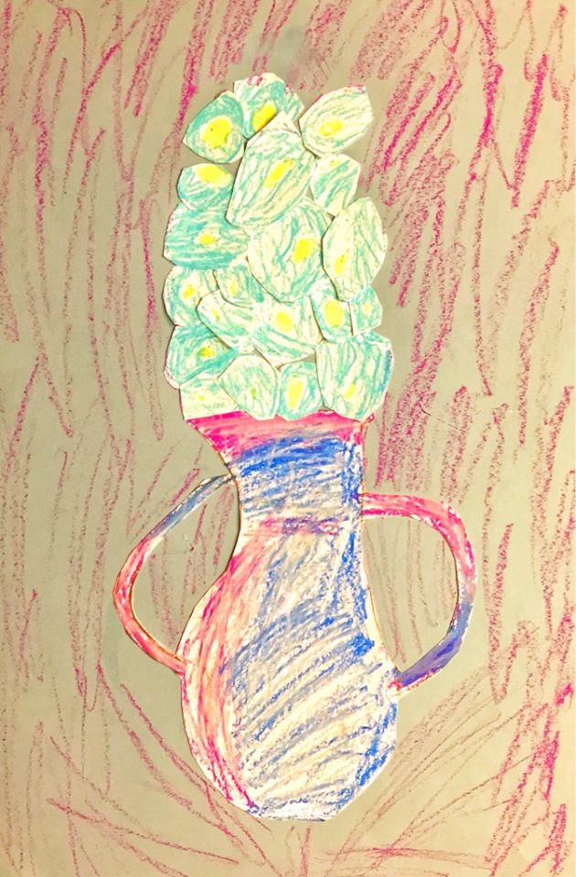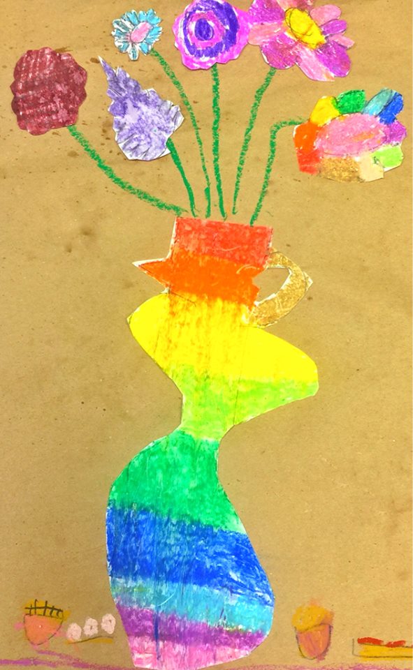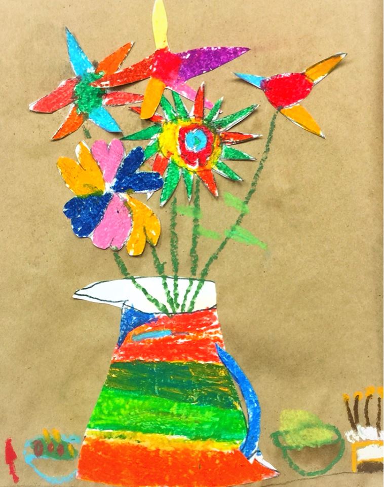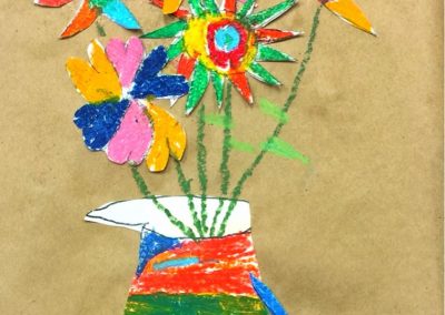 Students use drawing skills to create a large vase and flower collage with mixed media: Oil pastels, kraft paper, cutting, and gluing. Composition is worked on as they apply the shapes they’ve drawn and cut.– – –