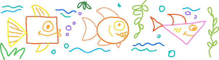 “Now we need to make plants, bubbles, and waves for our lake. Use the cool colors for that. As you work, you’ll see how making all the fish the only thing that is in warm colors, makes them stand out and look different.” We’ll just go a couple of more turns, and remember to draw in slow motion!”