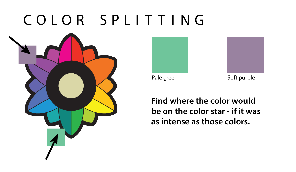 Split color – When a color is split, you choose the colors on either side of it on a color star or color wheel. Red is split to Red-orange and Magenta. Yellow-green becomes Yellow and Green.