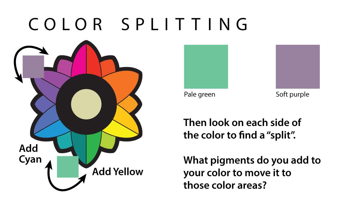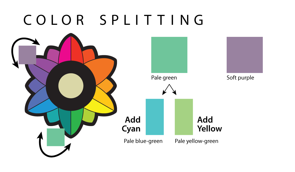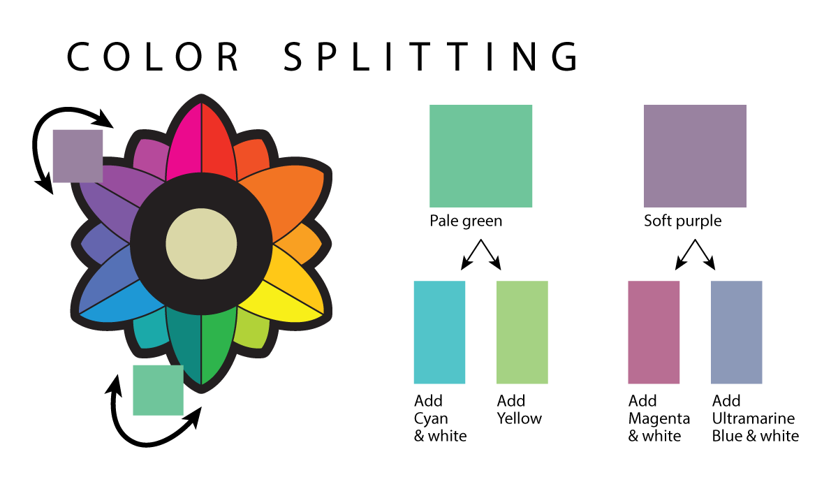 The purple is split too, by adding Magenta for one split color, and Ultramarine Blue for the other. Note that white must also be added to stay in the same value range.