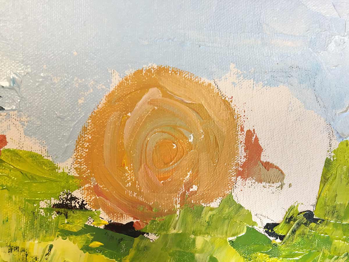 Mess up the colors so that the mingle a bit. Make sure to leave streaks and not do too much or you’ll just have one big color and a flat painting. Again, the chunks are in horizontal shapes, but the movement of the knife is made with short, up and down strokes so that the streaks look like grass.