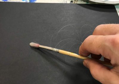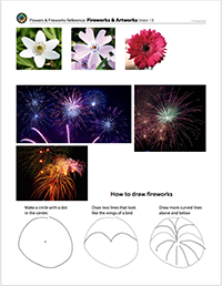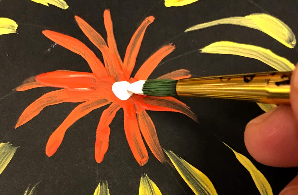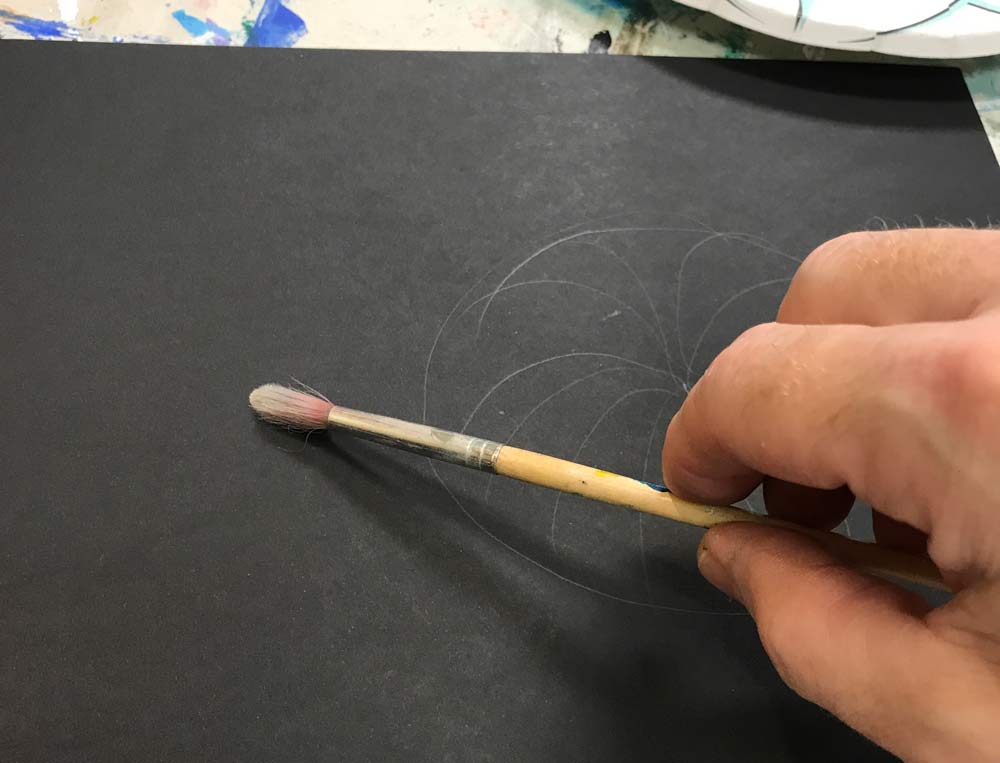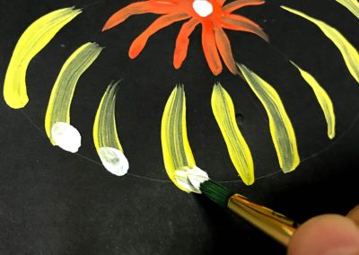 As soon as you get the paper, you can use your pencil to draw a circle with the center dot and the curved lines like we did a moment ago. These will be your guidelines for painting the fireworks.”