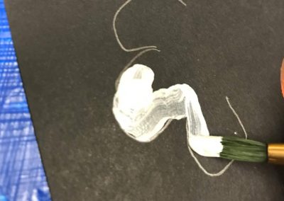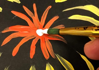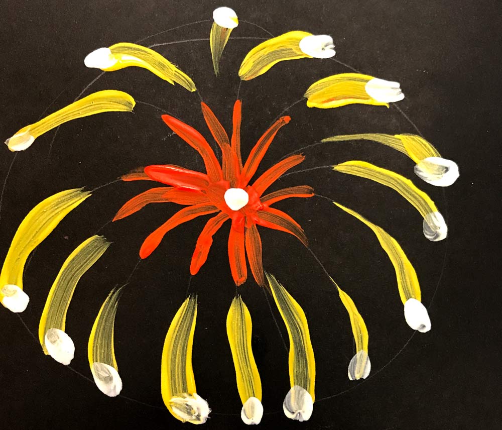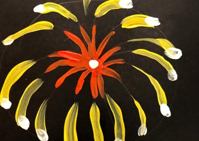 “Now we’re going to paint some fireworks! I’ll come around and change your paper from the white flower paper to the dark night sky paper.