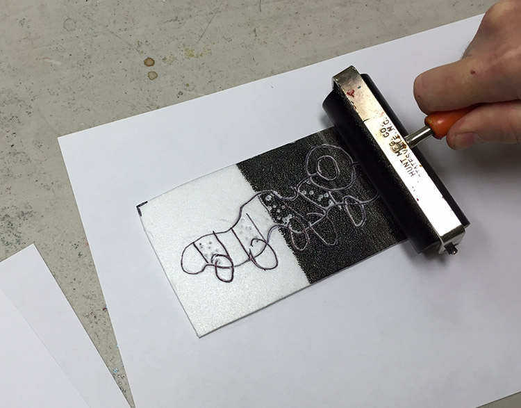- Printing: Place paper on the inked plate but do not move it once it touches or it will smear. It’s ok if it goes on crooked – that’s why we use larger paper. Use the dry roller to press and roll all over the paper. The ink will stick to the paper. Carry them to the next station still stuck together.