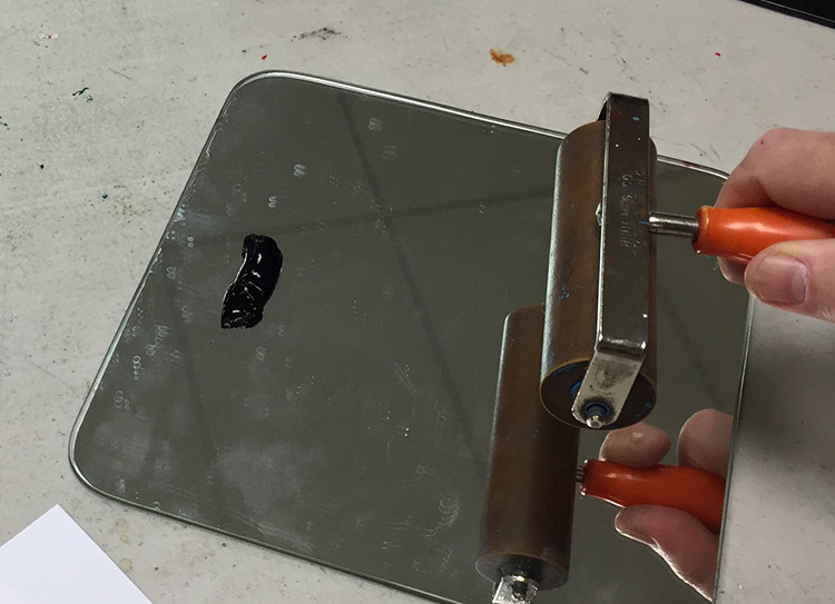- Inking: Squeeze a bit of ink onto the palette or glass and spread with the roller. Roll the ink around to get a thin layer of ink all over the roller (too thick of a coverage will fill the lines in, so keep it thin). Place print with the etched side up, and roller the ink all over it. Make sure to get good coverage and go over it several times until you don’t see any light areas (except the lines).