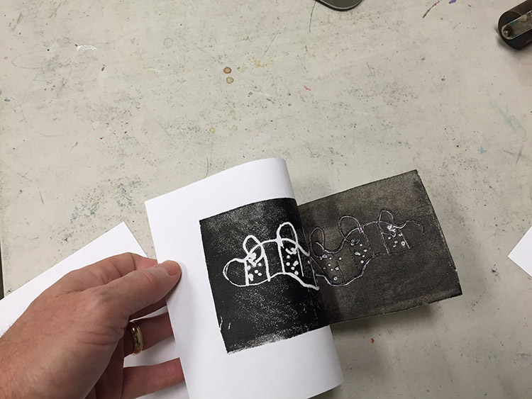 Use stations and have artists go around a station table or path. They’ll rotate through and make several prints from the one plate. Be patient and wait your turn! You can clean up and change the printing ink color in the middle if you want to make this more interesting and you have enough time.