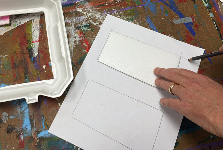 Students will need at least 3 sheets of regular sized copy paper with 1 rectangle traced on each of them. You can do this before-hand, or make them as needed by having a printing plate ready. We like to trace more as they need them so the kids see you do it, and make the connection to the printing plate. Students will draw images inside the rectangles. See the slide show in STEP 2 for more information on preparing the plates and papers.